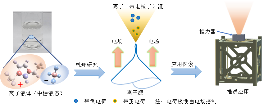 离子液体是一种由有机阳离子和有机或无机阴离子组成的固液转变温度(熔点或玻璃化转变温度)低于100℃的低温熔盐,具有真空不挥发,宽液态范围、绿色无毒等众多空间推进应用中理想的性质。通过合理控制外加电场可以将离子液体直接从液相转换成高速带电粒子(离子、离子簇、带电液滴)并产生推力,从而避免了传统气相电离推进方式中电子自由程对推力器尺寸的限制,以及碰撞电离带来的能量损失和复杂推力器结构。因此,离子液体电推进具有全面突出的潜在性能优势,是微纳卫星极具吸引力的动力解决方案。离子液体电推力器对结构部件的极致简化要求是工程应用的理想状态,但在其“简单”外表下的复杂机理问题,是研究人员必须深入探索理解以实现对更简单结构有效控制的基石,也是其背后更为复杂且极具魅力的科学本质。本项目在BEAT365英国官网博士论文创新基金资助下,以空间推进应用的重要需求为牵引,深入开展离子液体电致发射机理研究,探索离子液体电推进应用。