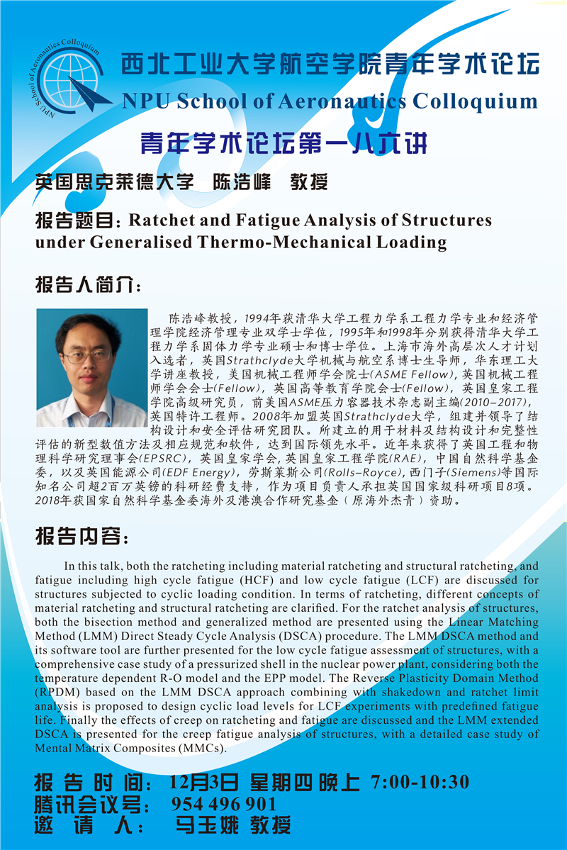 【学术报告】航空学院青年学术论坛186讲——英国思克莱德大学陈浩峰教授