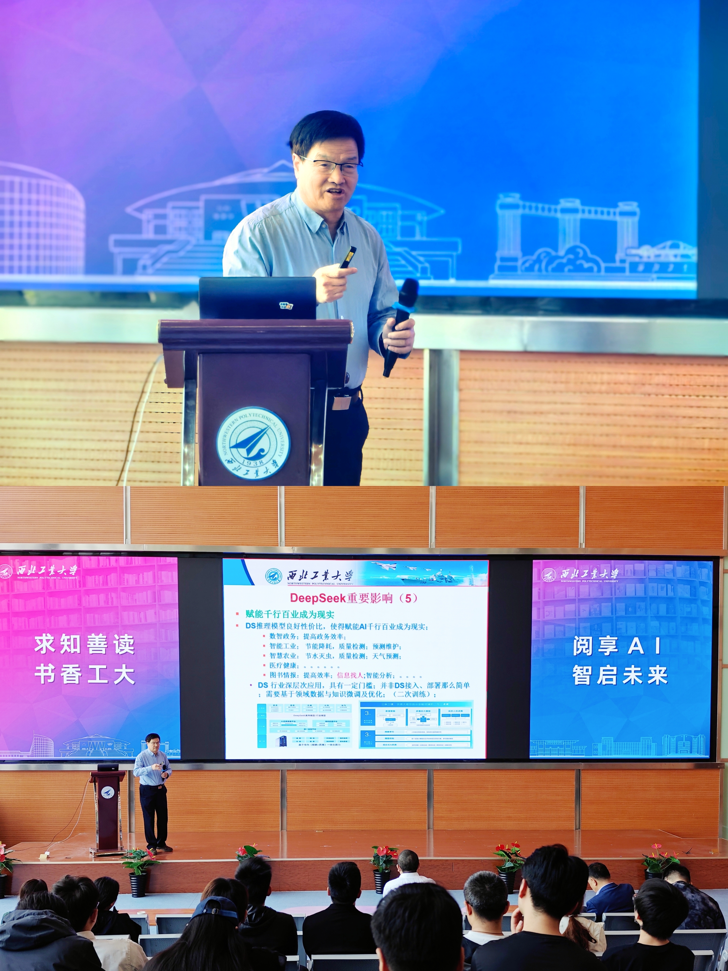 主题报告环节邀请到了计算机学院周兴社教授做了《生成式AI赋能高等教育及科研创新》学术讲座,他在分析以DeepSeek为代表的生成式AI技术创新特征的基础上,多维度阐述了其对高等教育和科研创新的影响,并提出如何深度应用Deepseek的几点认识。