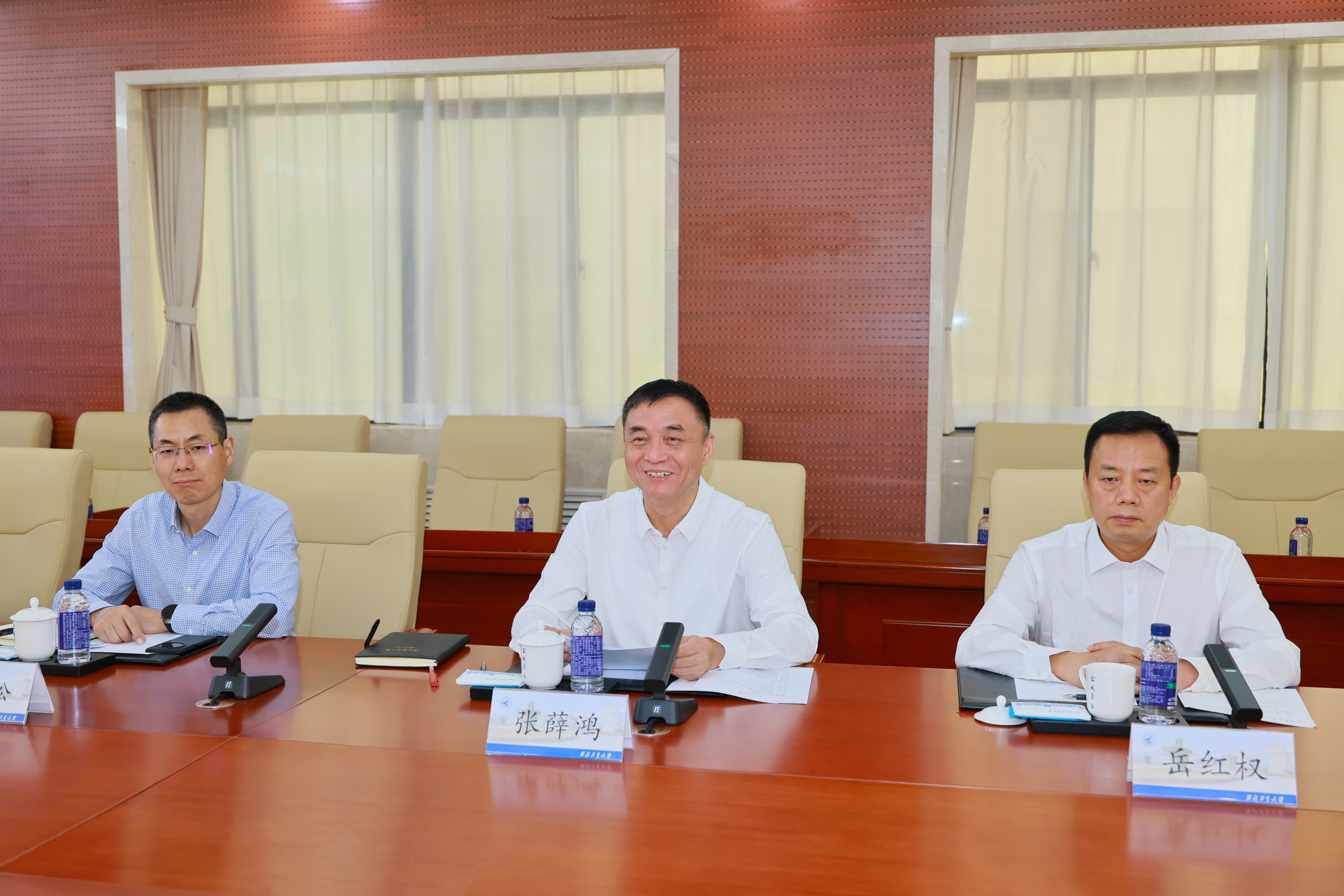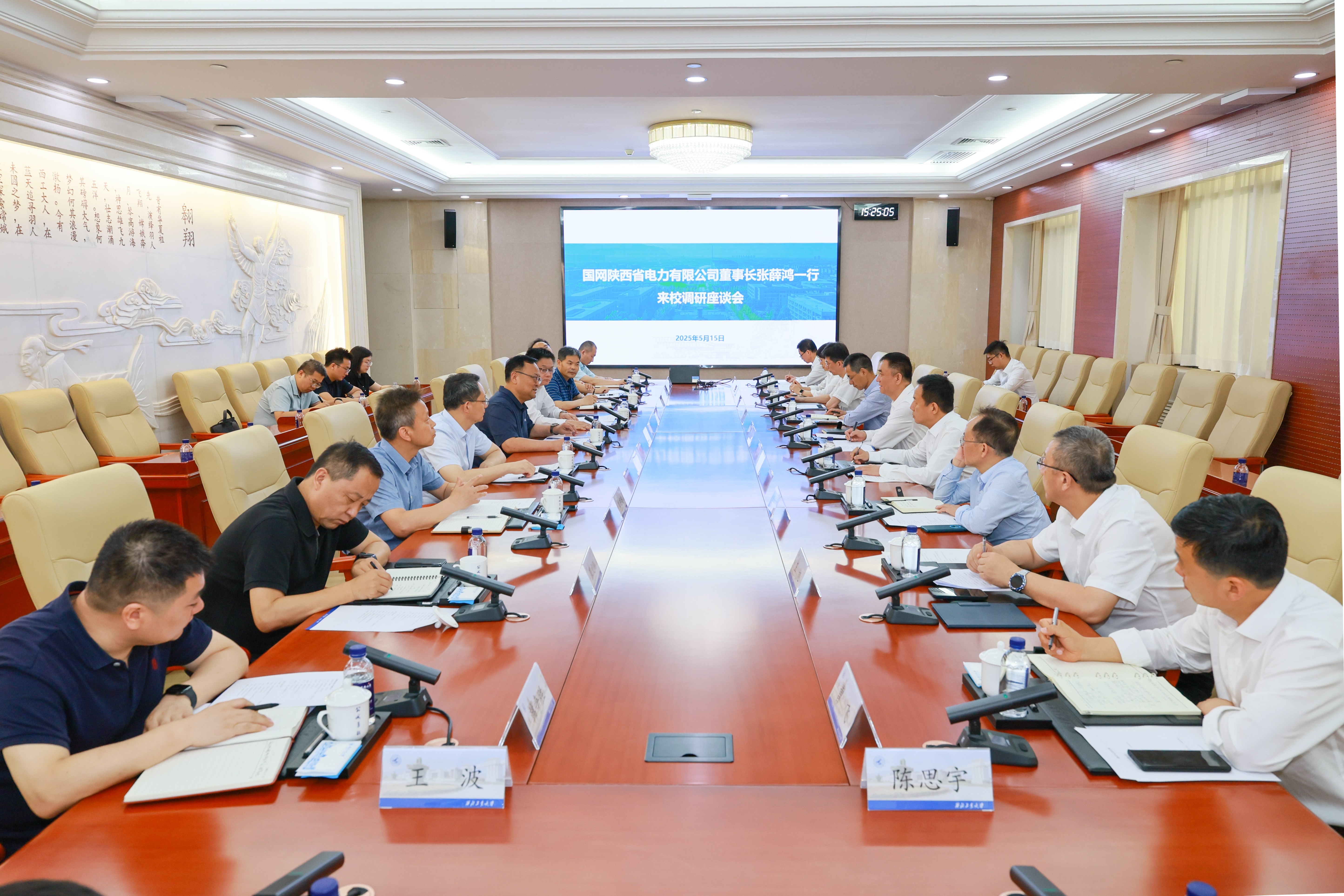 5月15日,国网陕西省电力有限公司董事长张薛鸿一行来校调研。国网陕西省电力有限公司副总经理岳红权,国网西安供电公司总经理余松,首席专家李红波等参加调研。校长宋保维与张薛鸿一行进行座谈。校长助理王宇波陪同调研并主持座谈会。