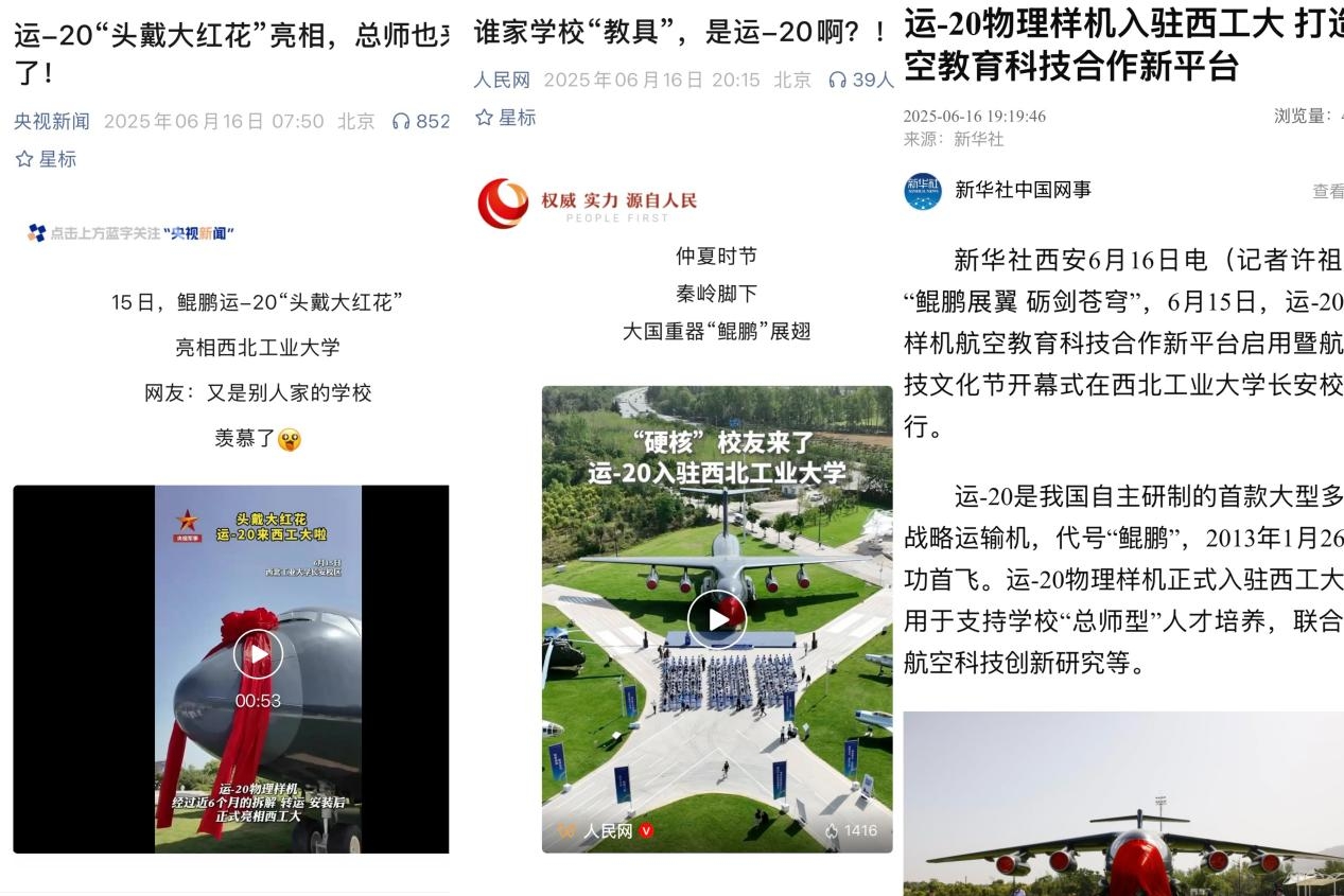 活动当天,央视、人民日报、新华社近20家媒体代表现场报道。其中,央视总台和陕西总站派出6位资深记者和主播庞大团队,央视军事频道启用了全方位报道,开展了对学校军工素质教育实践中心、航空学院仿生扑翼无人机、校史馆直播活动,在线观看人数超50万人。微信、微博、视频号、抖音、快手等全网新媒体和短视频平台播放量破亿。本次中央媒体以“运-20“头戴大红花”亮相,总师也来了!”“谁家学校“教具”,是运-20啊?!”多角度、全平台的系列报道引起了社会各界广泛关注,充分展示了学校“为党育英才、为国铸重剑”的良好形象。