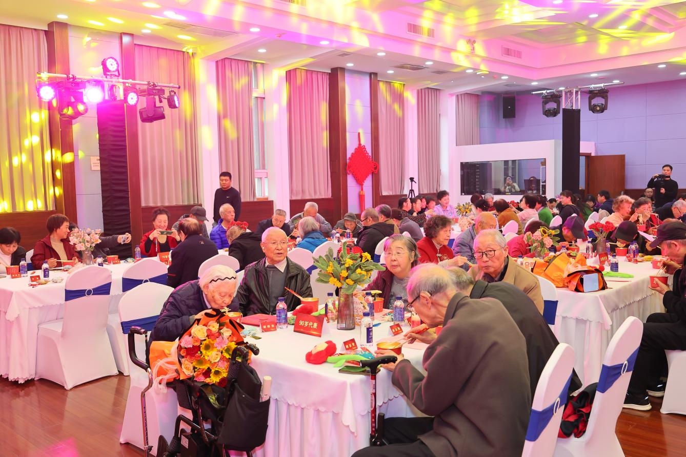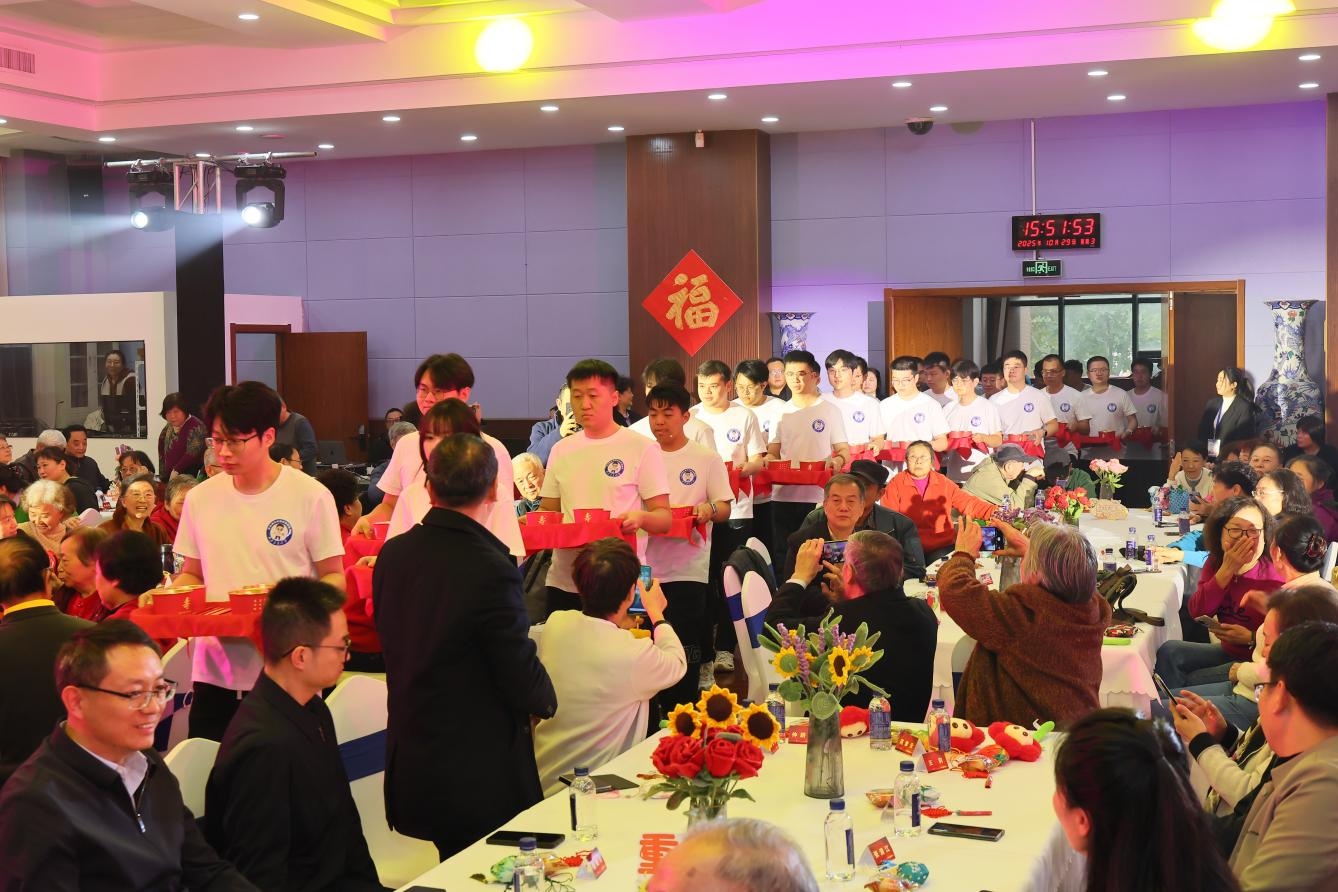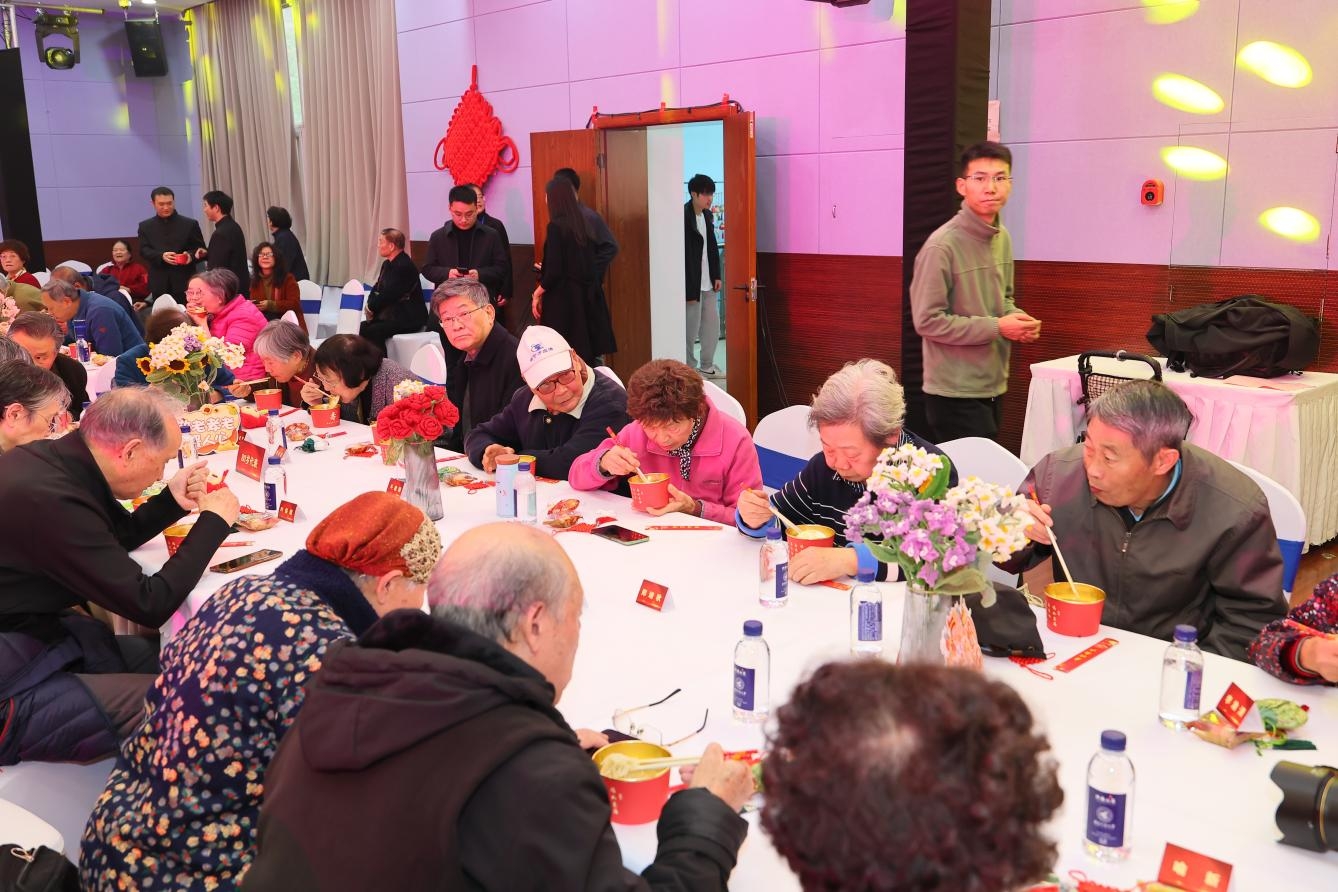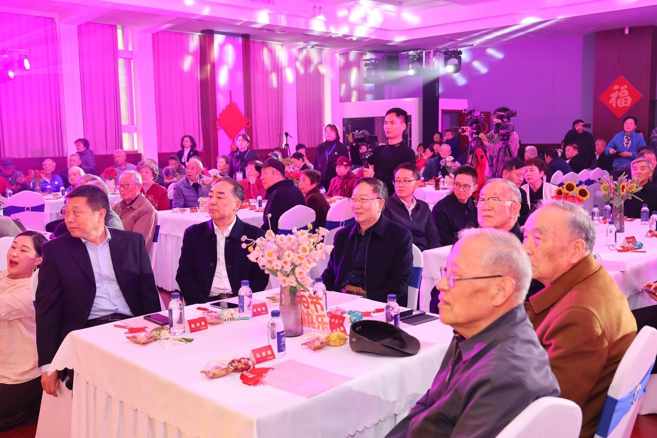 40位学生代表为老同志敬上长寿面,祈愿长辈福寿绵长。热气腾腾的长寿面承载着全校师生的祝福,会场内欢声笑语,气氛喜庆祥和。