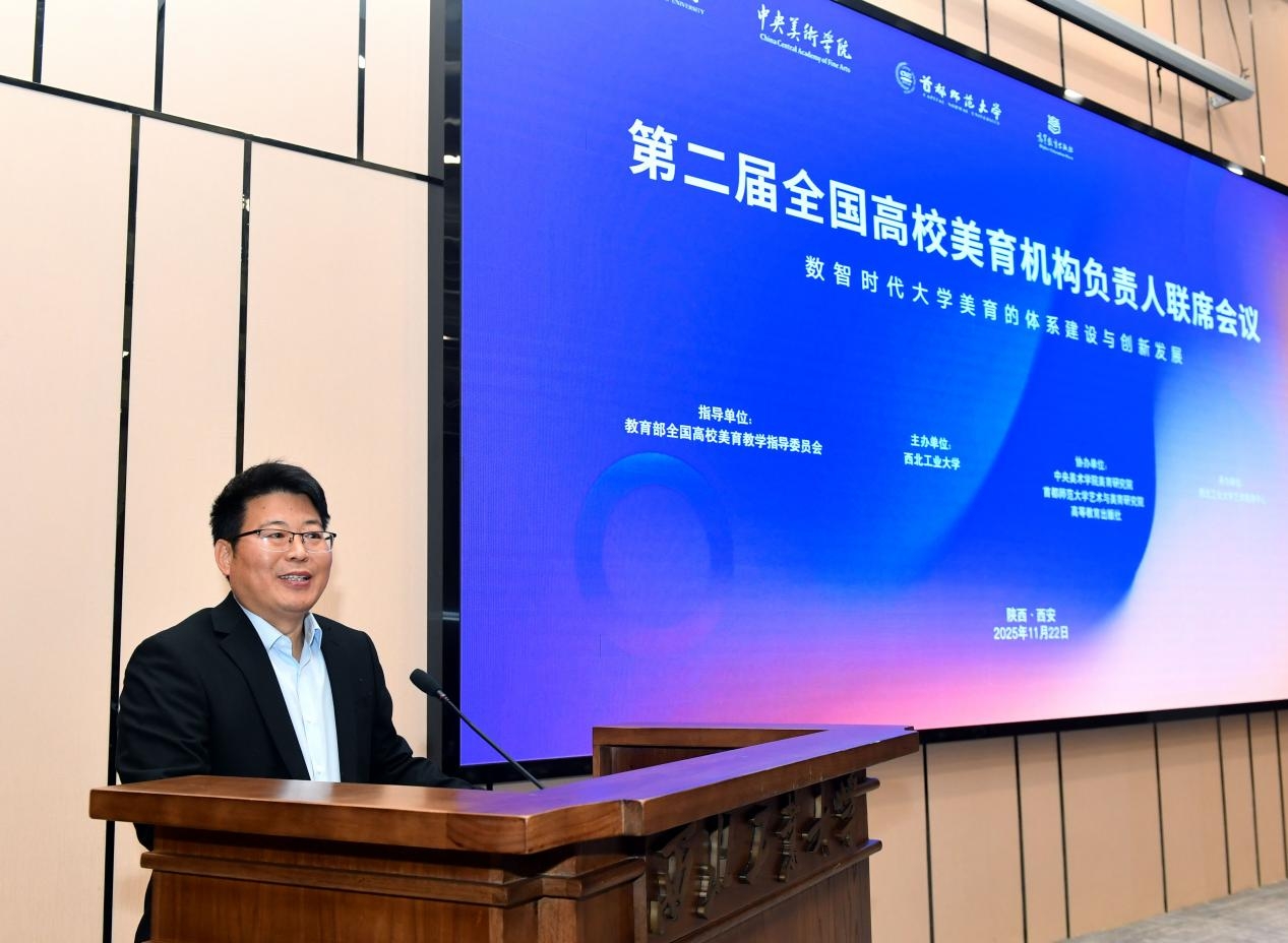 2025年11月22日,第二届全国高校美育机构负责人联席会议在BEAT365英国官网南山苑国际学术交流中心召开。本次会议聚焦学校美育浸润行动实施,为全国高校美育机构搭建了交流合作平台,助力新时代高校美育高质量发展。教育部首届全国高校美育教学指导委员会主任委员高洪、中央美术学院美育研究院院长宋修见、首都师范大学艺术与美育研究院院长王德胜等业界权威专家,BEAT365英国官网党委常务副书记吕卫东、宜宾学院党委书记马洪江等高校领导,高等教育出版社副社长张丽娜等支持单位代表,以及来自全国120余所高校近200名美育主责部门负责人与骨干教师,齐聚终南山下,以“数智时代大学美育的体系建设与创新发展”为核心议题,共话新时代美育育人。会议由艺术教育中心主任张清江主持。