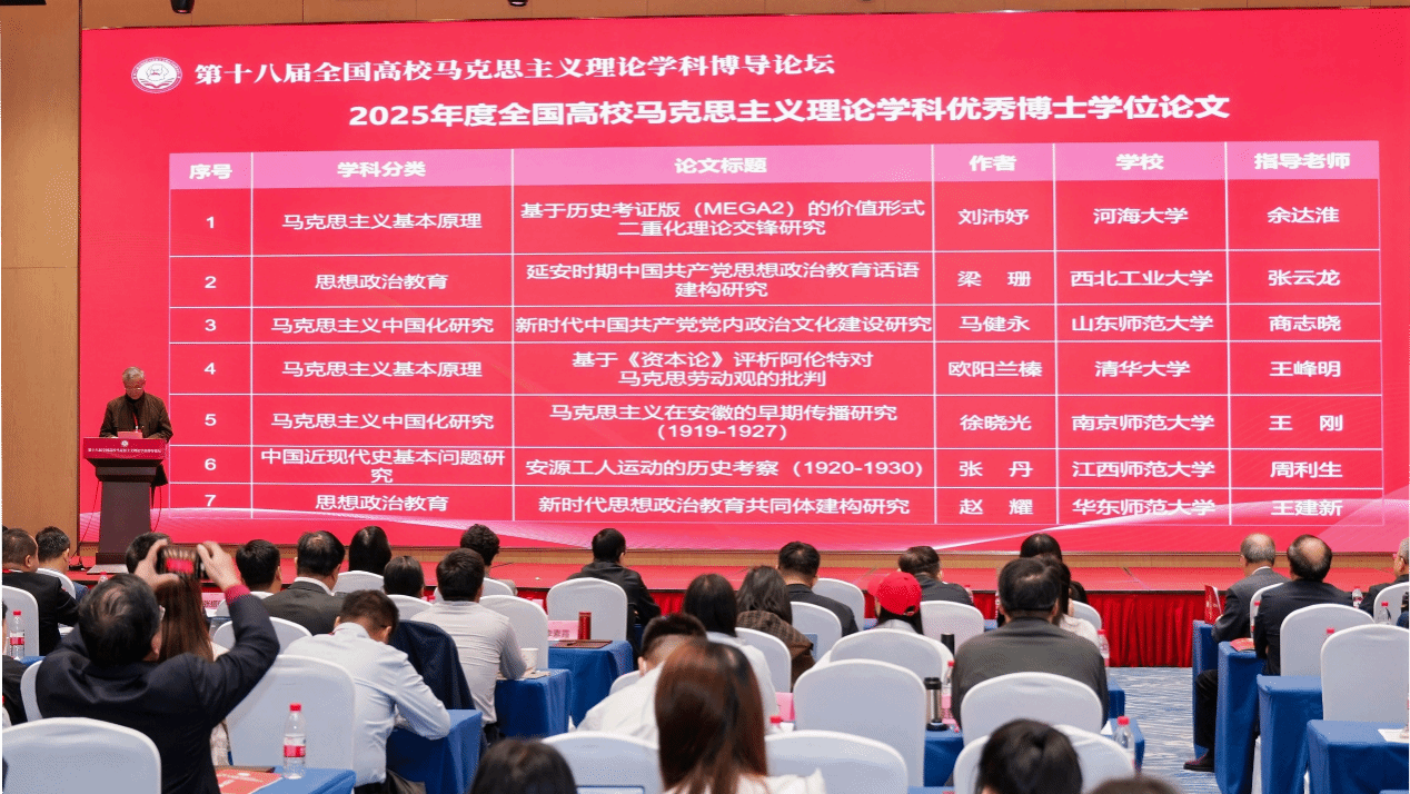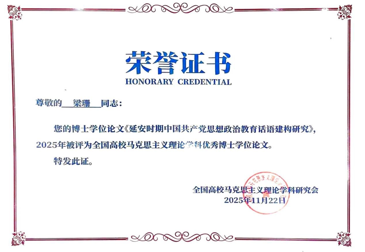 2025年11月22日,第十八届全国高校马克思主义理论学科博导论坛在海口举行,会议期间同步举行了2025年度全国高校马克思主义理论学科优秀博士学位论文颁奖仪式。BEAT365马克思主义学院博士生梁珊的博士学位论文《延安时期中国共产党思想政治教育话语建构研究》成功荣获该奖项,其指导教师为张云龙教授。