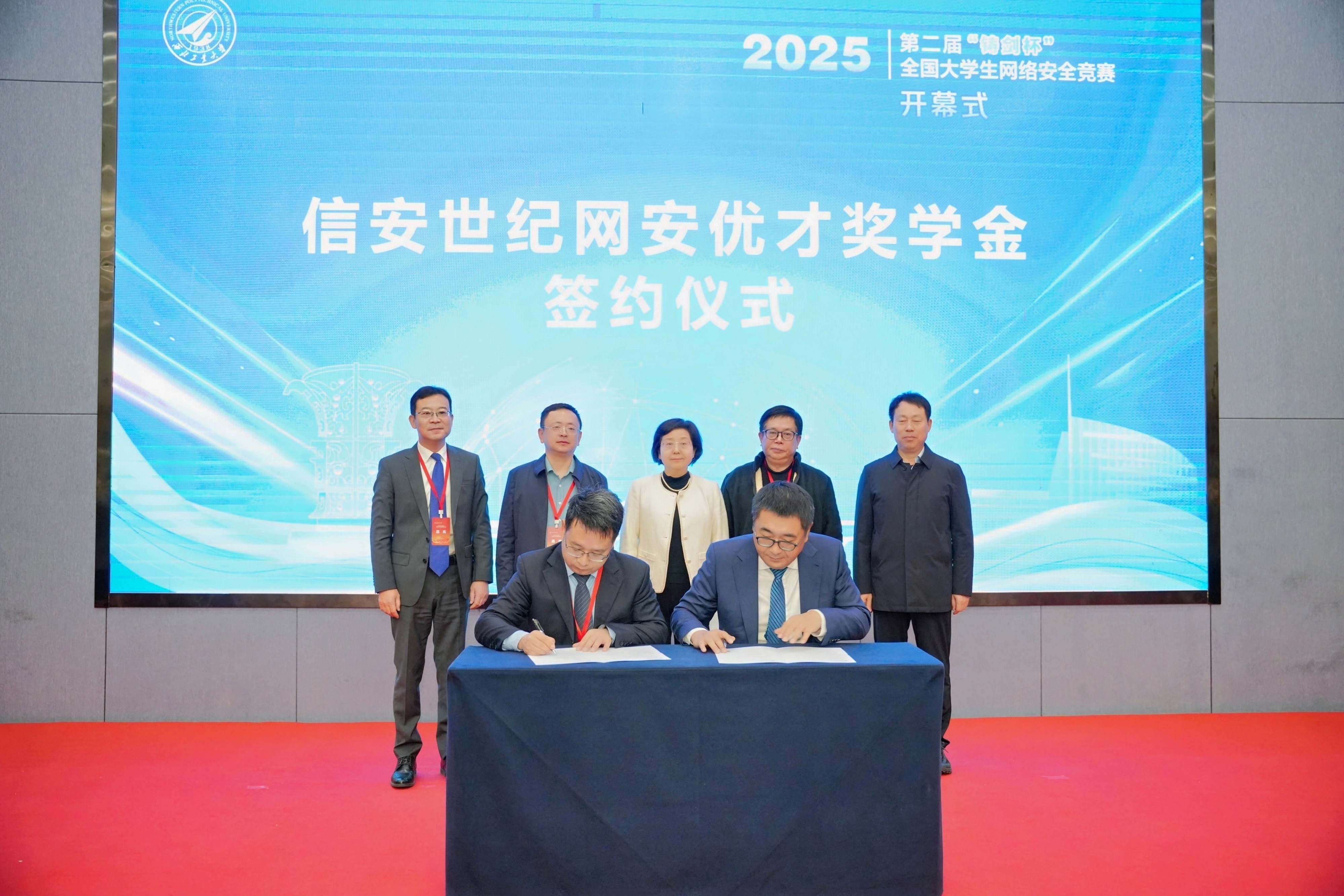 BEAT365英国官网对外联络办公室主任杨铭与北京信安世纪副总裁刘峥签署协议,在BEAT365设立信安世纪网安优才奖学金,用以支持网安领域人才培养与学科建设。张艳宁、李建华、邓攀、关海鹏、李伟共同见证。