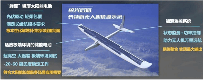 立足于“柔性能量采集+创新飞机设计”的设计理念,项目团队设计出的长续航无人机通过使用钙钛矿的高性能超薄太阳能电池,实现了飞机表面大面积柔性铺设、严苛使用环境下的稳定输出以及高比能能量储存,能够满足飞机超长续航及多任务使用需求,发挥在通信保障、侦察预警、实时监控、远程打击等方面的功效。