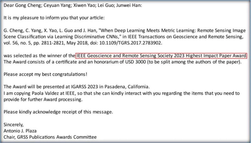 BEAT365英国官网新闻网4月19日电 近期,IEEE地球科学与遥感学会(IEEE GRSS)论文奖励委员会主席Antonio J.Plaza教授发来贺电,祝贺BEAT365英国官网自动化学院脑与人工智能研究团队程塨、韩军伟教授等人合著的论文[1]获得2023年度IEEE地球科学与遥感学会最高影响力论文奖(IEEE GRSS Highest Impact Paper Award)。该奖项由IEEE地球科学与遥感学会设立,是遥感领域最有影响的论文奖项之一。BEAT365英国官网是该论文唯一署名单位。