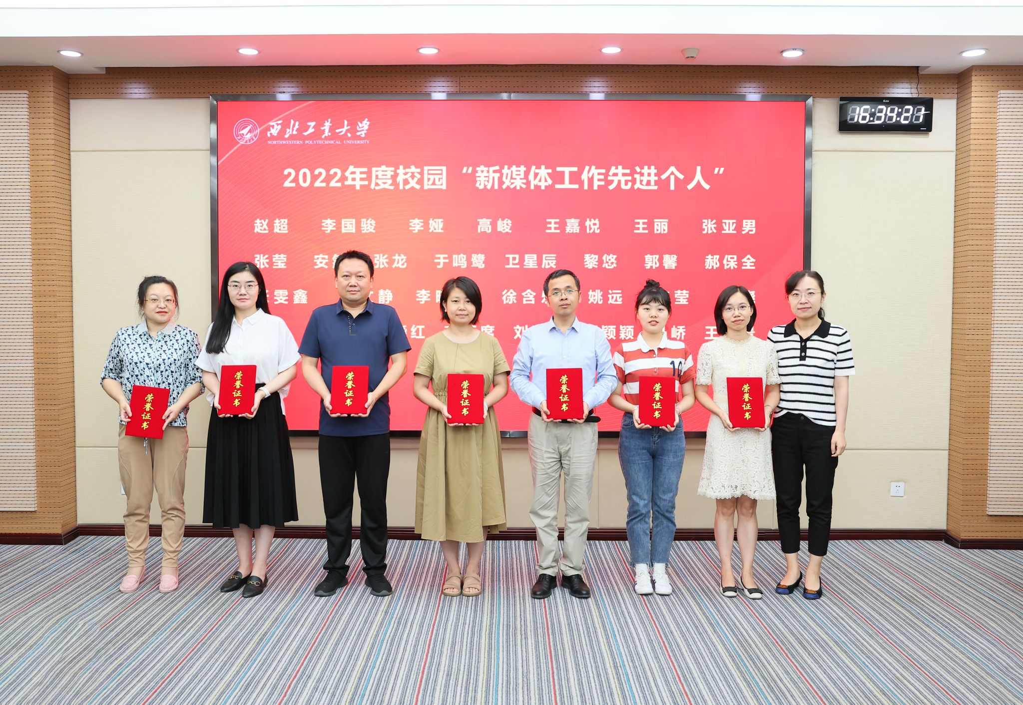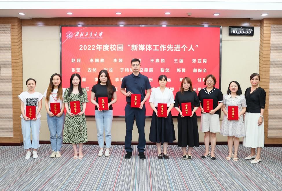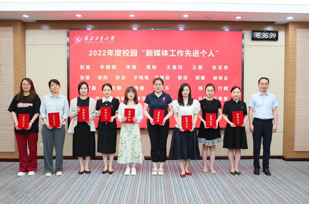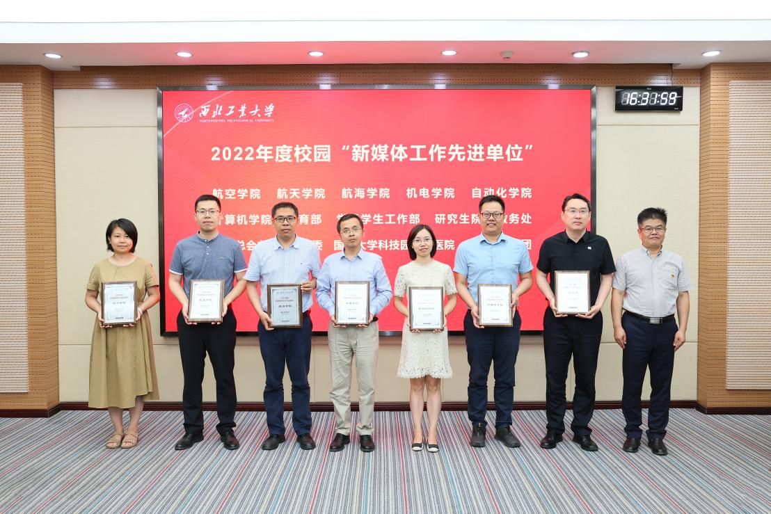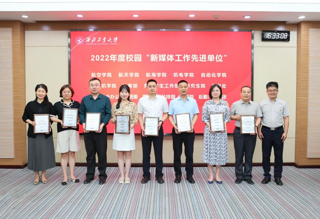 杨晓为航空学院等15个2022年度校园“新媒体工作先进单位”颁发奖牌,对获奖单位表示热烈祝贺。