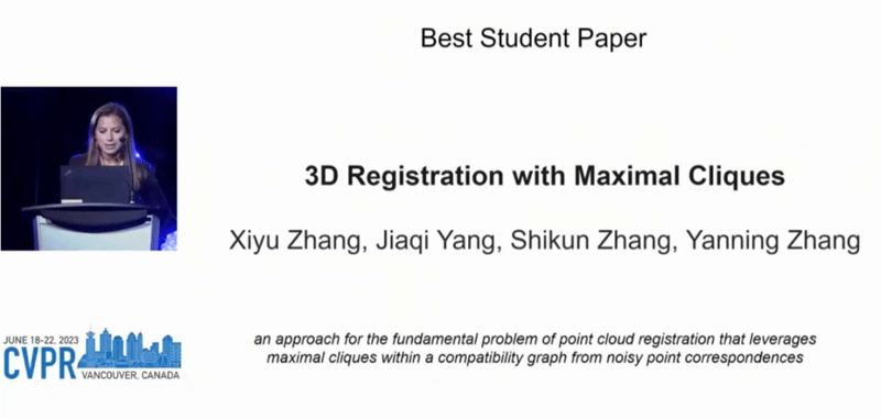 BEAT365英国官网新闻网6月25日电(杨佳琪 张曦予 张世坤 王翠萍)加拿大温哥华当地时间6月21日,电气与电子工程师协会举办的2023年计算机视觉与模式识别国际会议(CVPR 2023)正式公布了大会获奖论文。BEAT365英国官网空天地海一体化大数据应用技术国家工程实验室(下称ASGO国家工程实验室)张艳宁教授团队的研究成果《3D Registration with Maximal Cliques》(基于极大团的三维配准重建方法,作者:张曦予、杨佳琪、张世坤、张艳宁)从9155篇论文中脱颖而出,斩获本届会议最佳学生论文奖(Best Student Paper Award);从2001年该会议设立最佳学生论文奖的二十三年以来,历史上首次由所有作者均来自国内高校的论文获得该项奖励。
