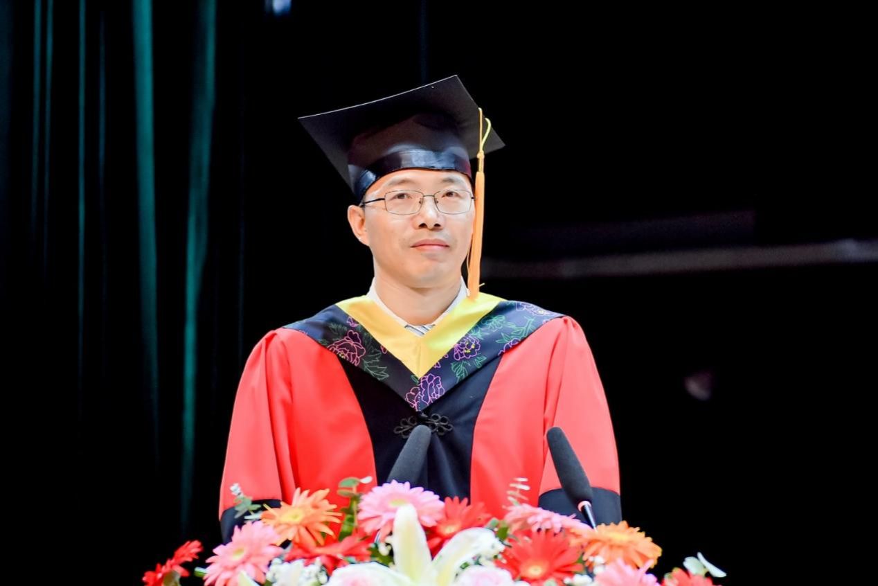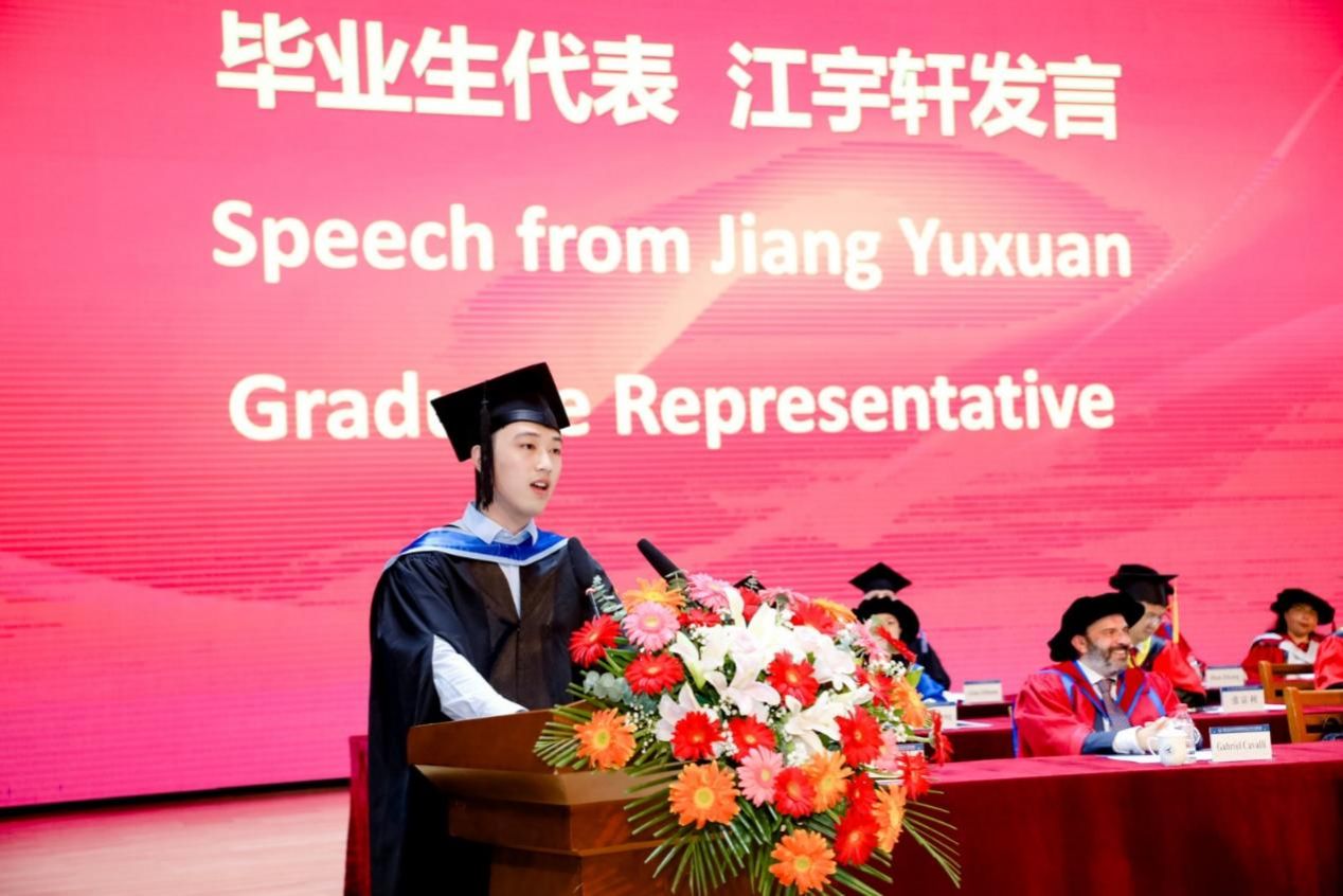 江宇轩同学作为毕业生代表发言。首先,他代表全体毕业生向母校、师长、家人和朋友致以感谢,回顾了四年来在学院的学习及生活经历。他表示,学院国际化的教育教学模式和师长、朋辈间的鼓励与关怀,让同学们从最初懵懂茫然的新生成长为如今独立自信、勇于担当的时代青年。通过参与社会实践、创新创业等活动,同学们不断突破自我,跳出舒适圈,不仅在学业上取得了优异的成绩,更是成长为具有综合实力的国际化人才。