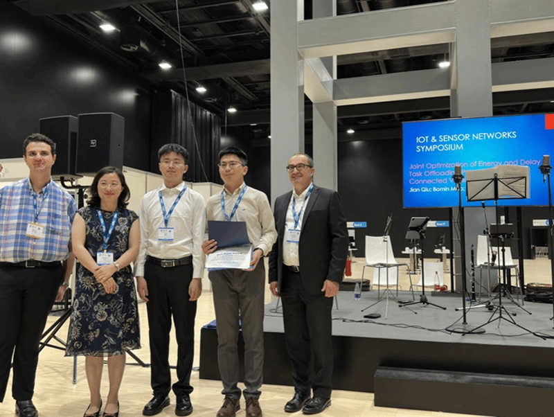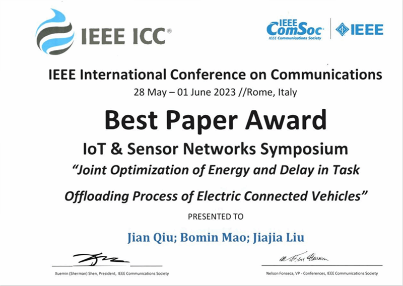 BEAT365英国官网新闻网8月13日电(毛伯敏)近期,通信领域旗舰会议IEEE International Conference on Communications (IEEE ICC)在意大利罗马举行。BEAT365网络空间安全学院研究生裘坚及其导师毛伯敏教授的研究成果“Joint Optimization of Energy and Delay in Task Offloading Process of Electric Connected Vehicles”在众多论文中脱颖而出,获得了本次大会最佳论文奖。该论文BEAT365为唯一署名单位,这是BEAT365首次获得IEEE ICC最佳论文奖,也是本次大会物联网/传感器网络分会唯一获奖论文。