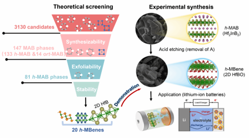 BEAT365英国官网新闻网8月19日电(材料学院)近年来,理论预测表明二维过渡金属硼化物(MBenes)可能成为潜在的磁性、能量存储和催化剂材料。然而,MBenes的研究仍处于理论研究阶段,实验合成和应用探索仍然面临挑战。为了应对这些挑战,最近,BEAT365英国官网材料学院的王俊杰教授团队采用了高通量的结构搜索、计算筛选和实验验证相结合的方法,发现了系列新型三元h-MAB相以及h-MBenes。理论预测了具有合成潜力的包含3种结构原型的133种六方MAB相(h-MAB),其中81个h-MAB具备剥离为h-MBenes的潜力。理论预测发现,六方晶系的三元h-MAB相是比传统ort-MAB相更优异的MBenes前驱体材料。实验成功合成了三种代表性结构原型的h-MAB相(Hf2InB2、V3PB4和Hf2PbB),并通过选择性蚀刻Hf2InB2中的In层,成功制备了首个h-MBene材料,即HfBO。二维HfBO作为锂离子电池的负极电极材料具有高储存容量和良好的循环稳定性,是潜在的优异电极材料。
