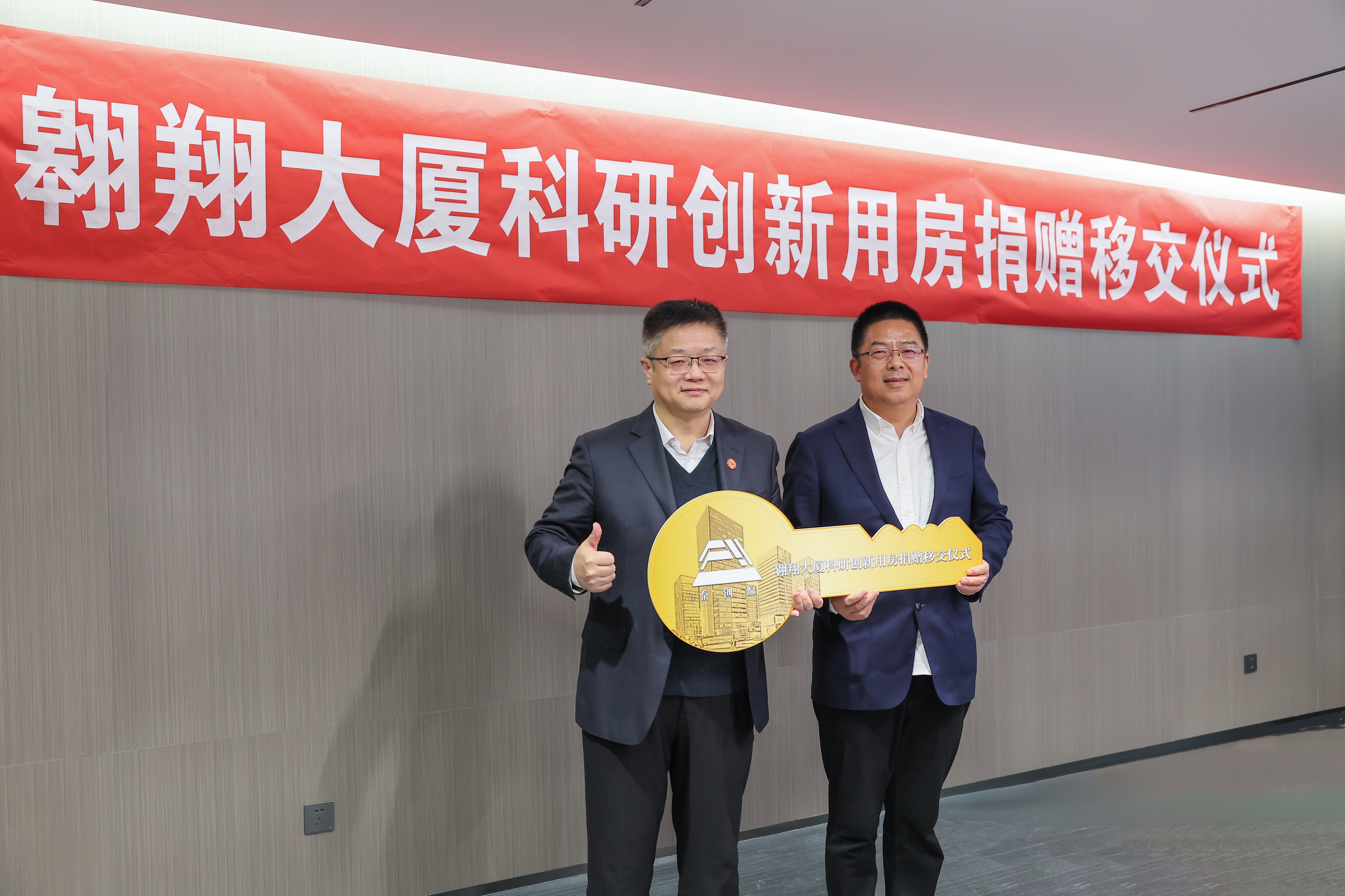 南鲁文,校长助理、教育基金会理事长王宇波代表双方进行秦创原·翱翔大厦科研创新用房捐赠移交仪式。