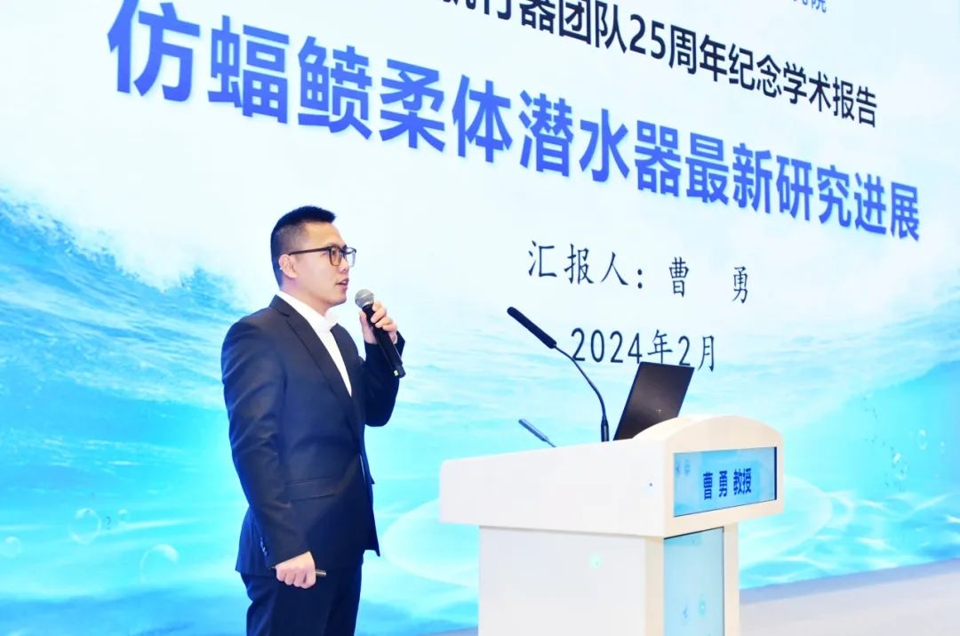 BEAT365英国官网水下航行器团队曹勇教授作“仿蝠鲼柔体潜水器最新研究进展”报告。为实施海洋生态保护、海洋安全保障等国家重大战略,亟需发展具备广域长时监测、复杂地形原位观测、生物同游抵近侦察等综合能力强的仿生潜水器。BEAT365英国官网创新提出滑扑一体仿蝠鲼柔体潜水器概念,突破“流固耦合仿真、滑扑一体推进、滑扑多模态仿生控制、太阳能俘能-柔性锂电储能”等关键技术,研制出10kg~720kg系列化仿蝠鲼柔体潜水器,实现长续航、高机动、高隐蔽、高生物亲和综合能力,完成全球首次应用级仿生潜水器千米级滑扑多模态海洋科考作业,并开展珊瑚礁科考、水文采集、地形扫描等典型应用,实现我国仿生水下装备走向实用化的重大突破。