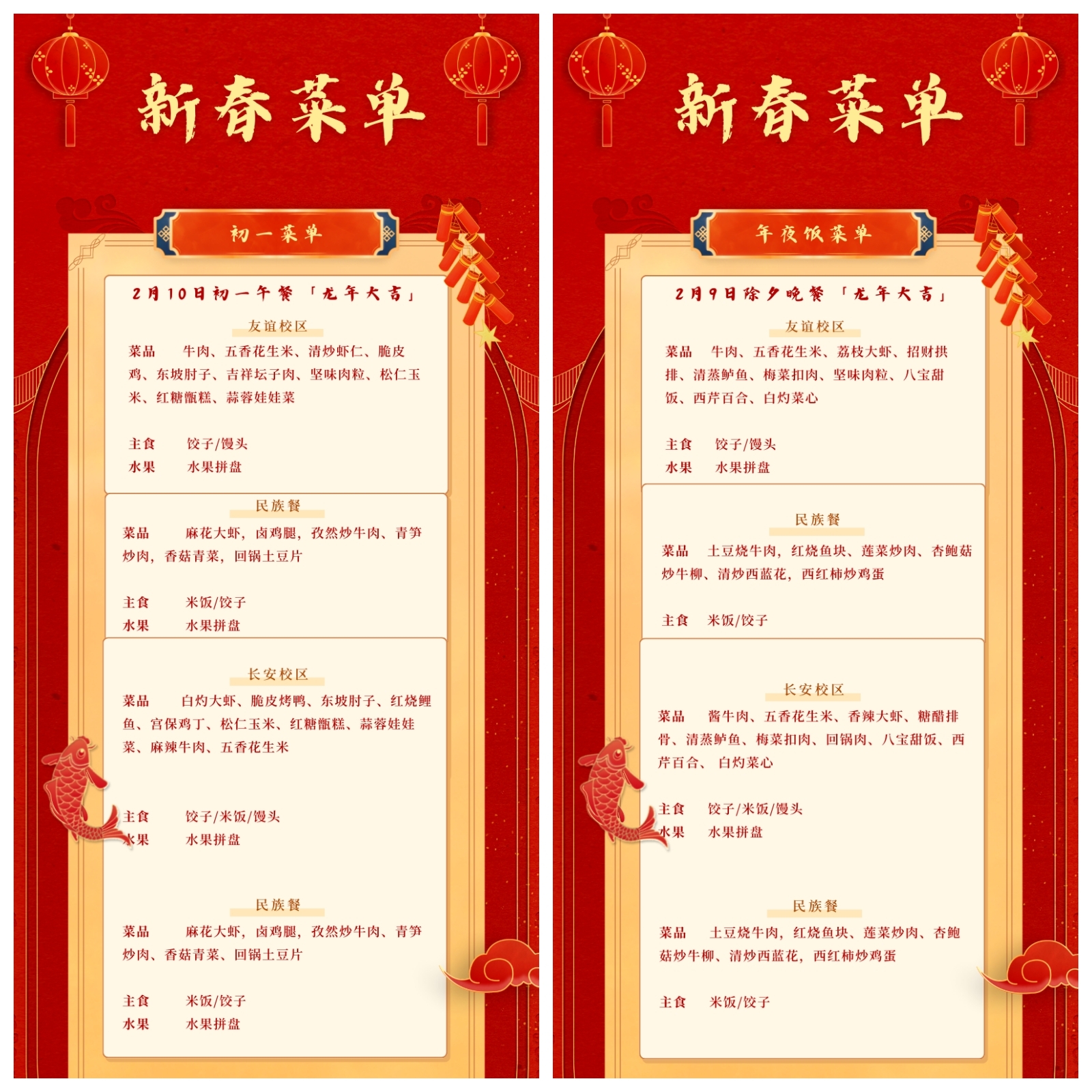 除夕和初一,学校均准备有免费享用的新年大餐。愿你在校如在家,身处异乡,年味不减。