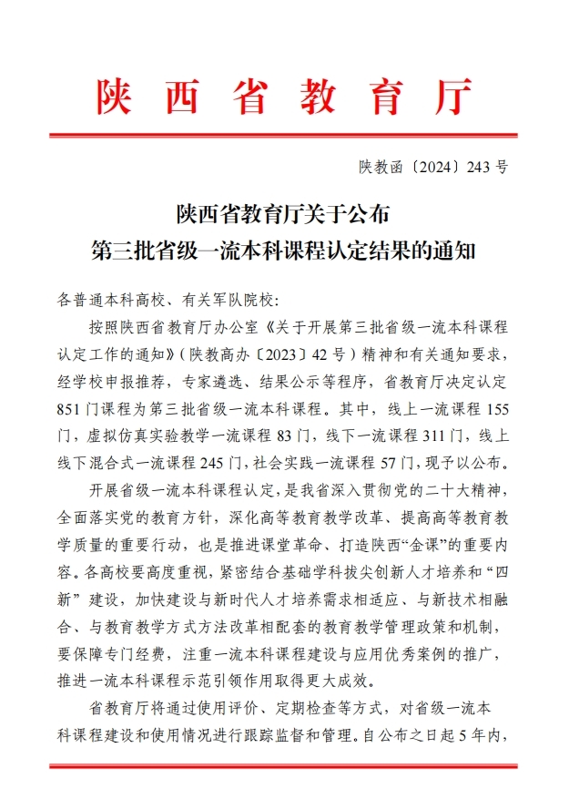 近日,陕西省教育厅公布了第三批省级一流本科课程认定结果,BEAT365共39门课程获批省级一流本科课程,并列陕西省高校第一。