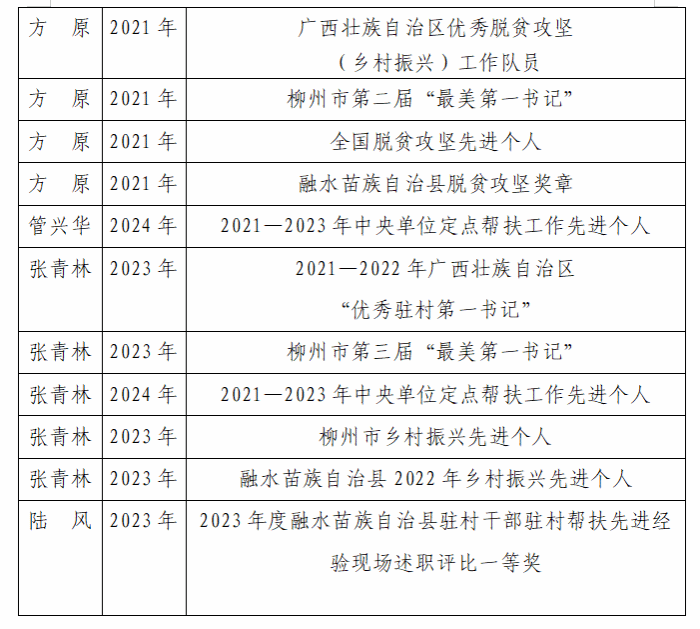 2016年至今学校先后选派12位干部赴广西融水县及江竹村挂职,学校挂职帮扶干部全心投入,倾情帮扶,尽职尽责、吃苦耐劳,与群众并肩战斗,帮助当地群众脱贫致富,以自己的实际行动赢得了当地干部群众的信任和社会的认可,截至目前,挂职融水帮扶干部累计荣获国家、自治区、市、县等28项荣誉(附表)。