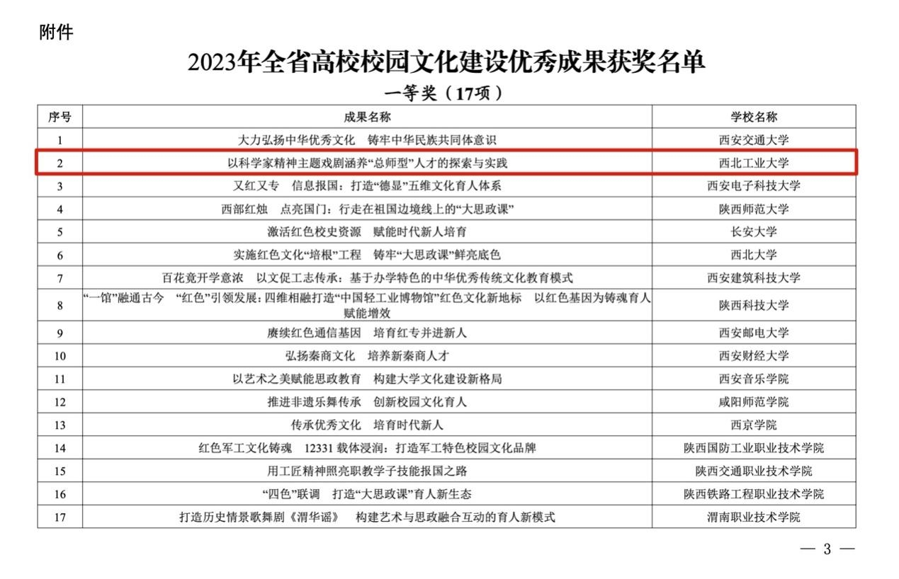 3月13日,经中共陕西省委教育工作委员会评选,2023年全省高校校园文化建设优秀成果获奖名单揭晓(陕教工宣办〔2024〕5号),BEAT365英国官网申报的《以科学家精神主题戏剧涵养“总师型”人才的探索与实践》荣获一等奖。