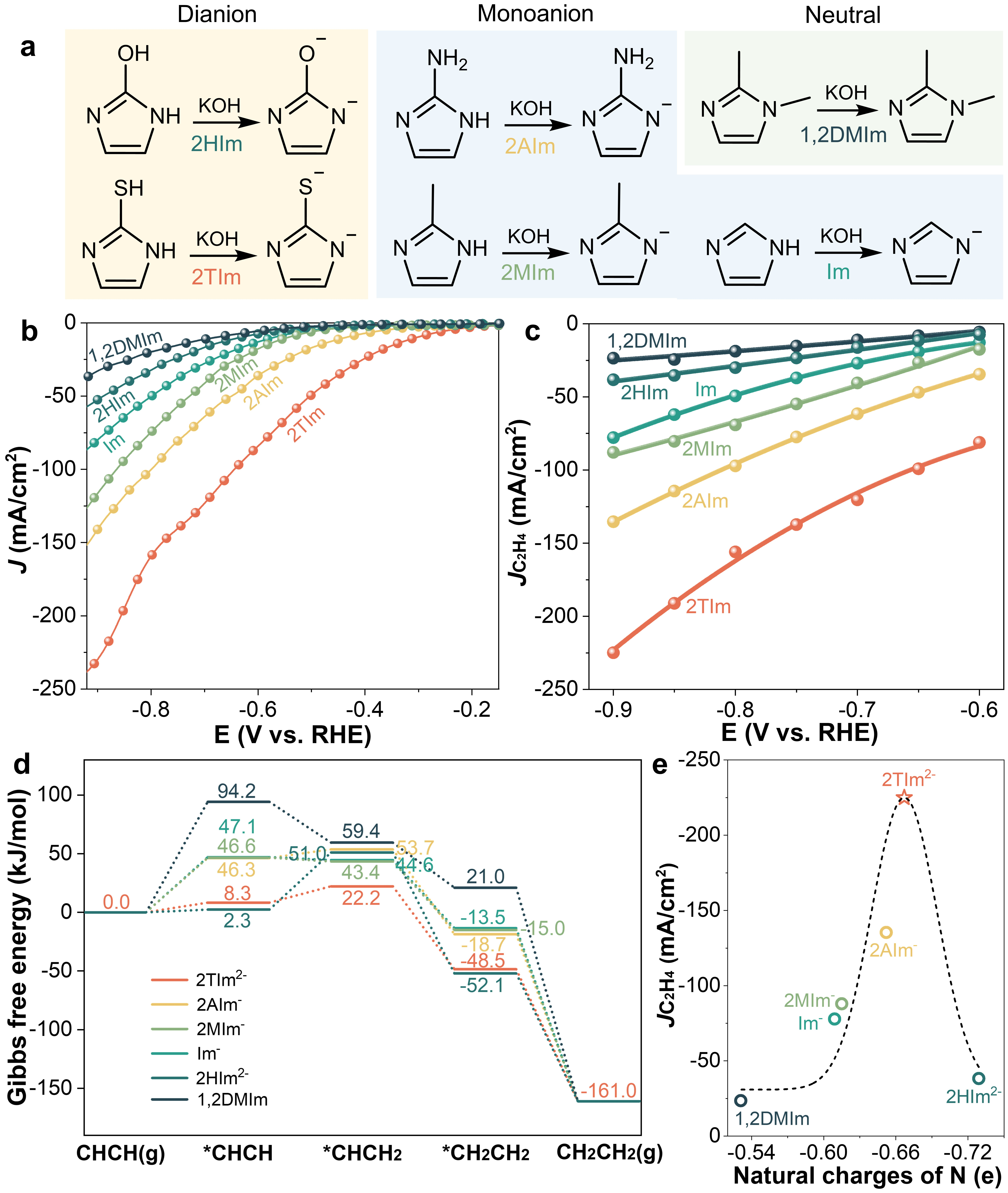 图1.不同咪唑衍生物的作用机理研究。a 不同咪唑衍生物在1MKOH溶液中的去质子化示意图;不同咪唑衍生物在1M KOH水溶液中纯乙炔流下的b 极化曲线和c 乙烯分电流密度;d不同咪唑衍生物在0 V下乙炔半氢化生成乙烯的吉布斯自由能图;e不同咪唑衍生物的乙烯分电流密度与其吡啶氮自然电荷的相关性