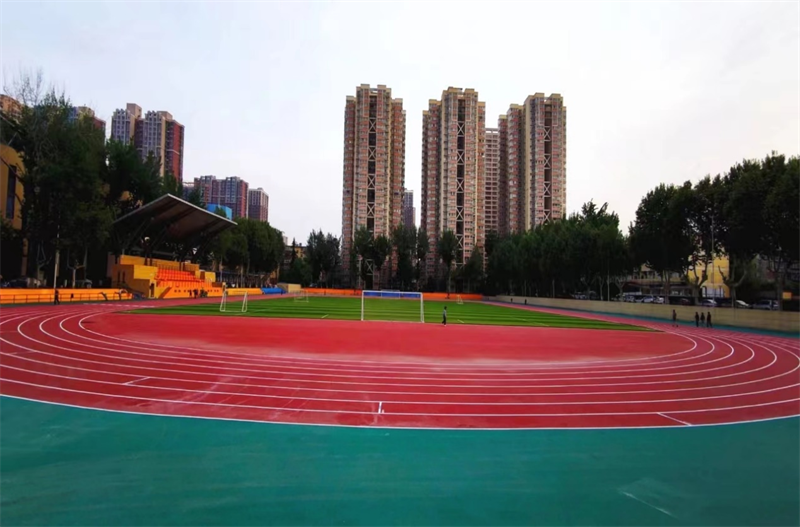 施工过程中,现场靠尺、水准仪全程测量,随测随铺,完成平整度验收合格后方可进行下一区域铺设。跑道面层铺设的平整度误差不大于3mm,标准跑道的纵向坡度(跑进方向)不大于0.1%,横向坡度(由外沿向内沿,垂直于跑进方向)不大于1%,跑道面层颜色均匀一致,无色差。跑道面层的物理机械性能与有害物质,均通过中国田径协会田径场地人工合成面层实验室检测,检测结果符合国标体育场地使用要求。
