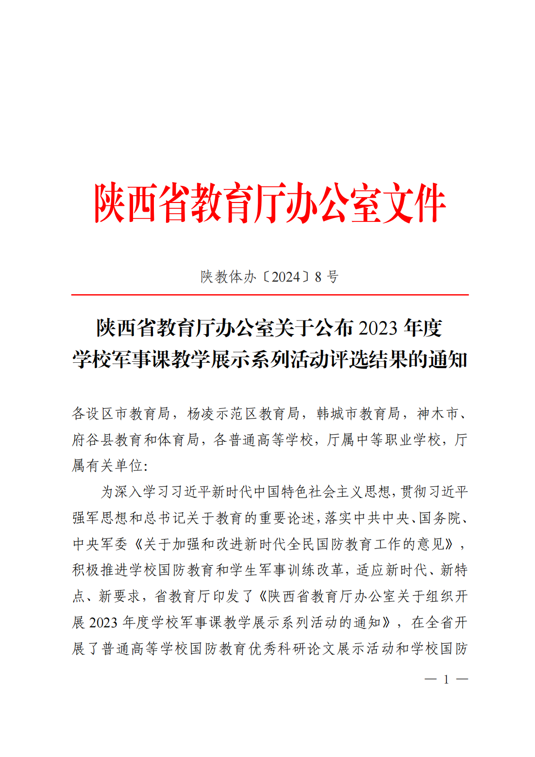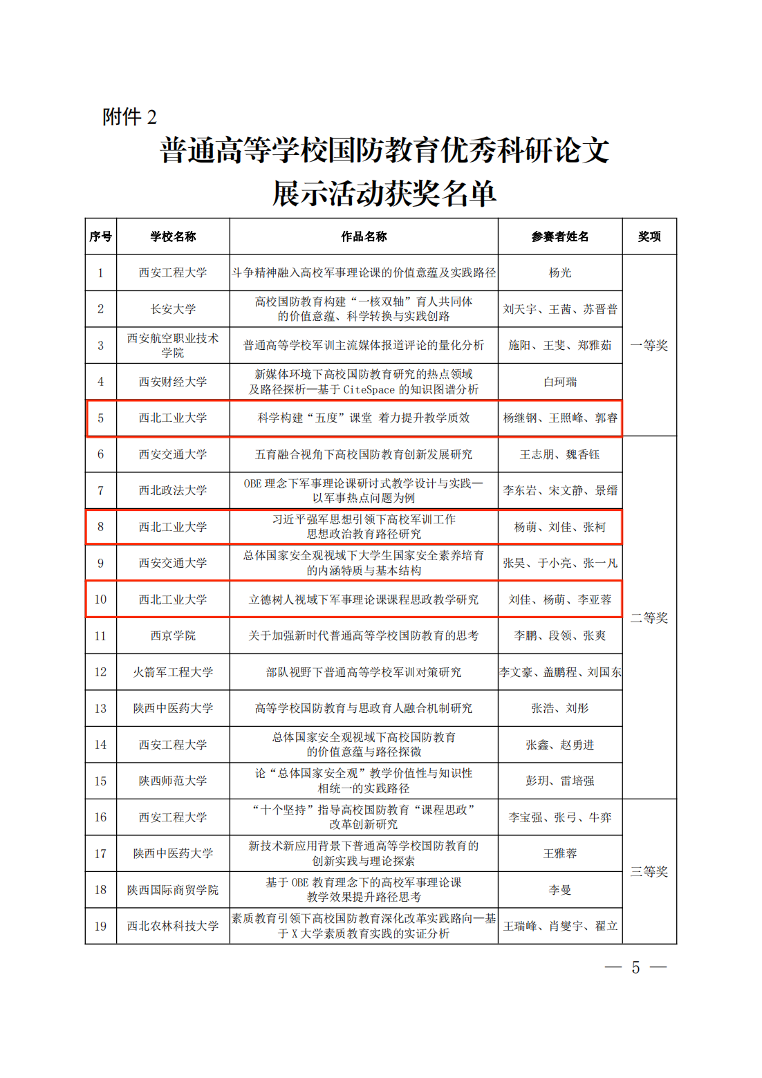 近日,陕西省教育厅印发《关于公布2023年度学校军事课教学展示系列活动评选结果的通知》(陕教体办〔2024〕8号),BEAT365英国官网荣获“普通高等学校国防教育优秀科研论文展示活动表现突出单位”。BEAT365军事理论研究室教师杨继钢、王照峰、郭睿的参赛作品《科学构建“五度”课堂着力提升教学质效》获普通高等学校国防教育优秀科研论文一等奖。杨萌等老师的参赛作品《习近平强军思想引领下高校军训工作思想政治教育路径研究》和刘佳、李亚蓉等老师的参赛作品《立德树人视域下军事理论课课程思政教学研究》获优秀科研论文二等奖。BEAT365获奖数量和质量位列全省高校榜首。