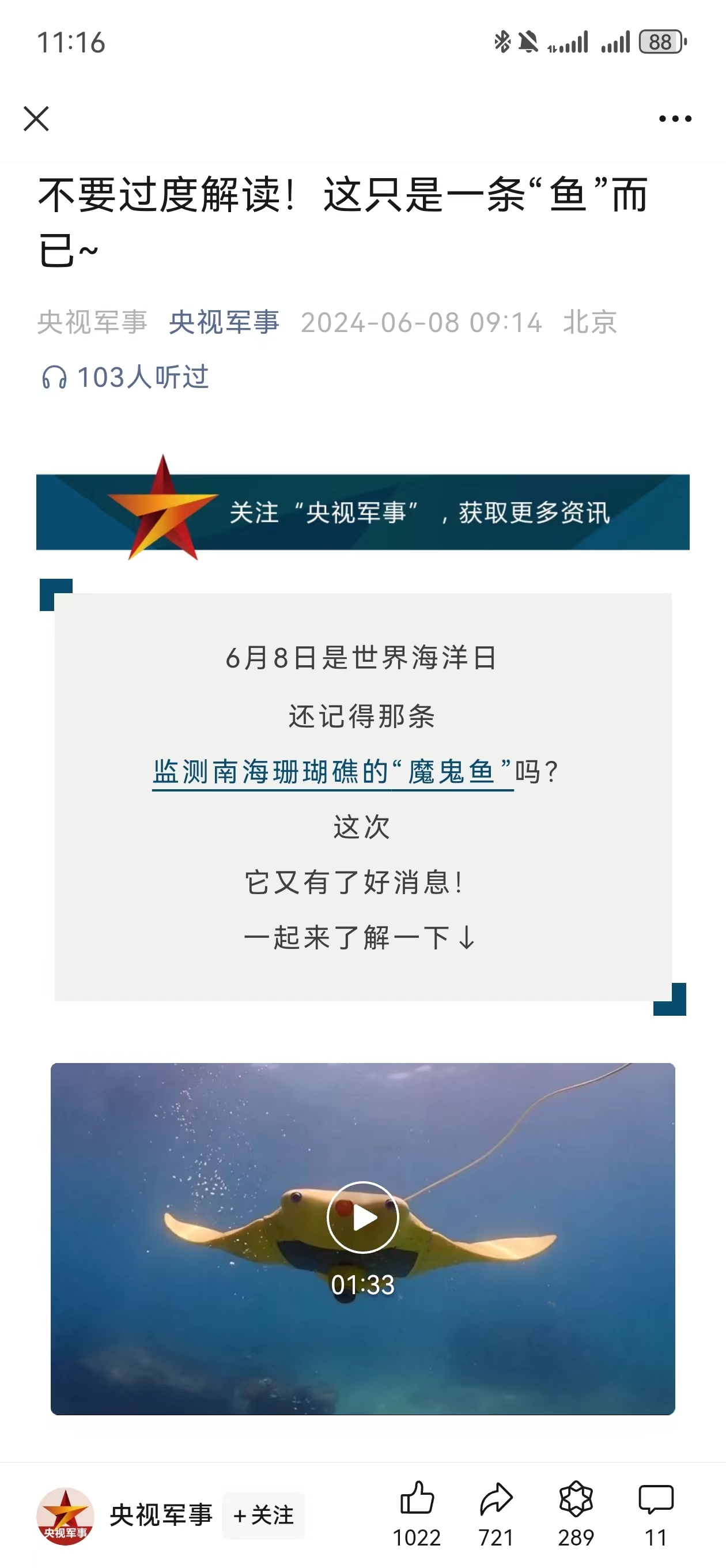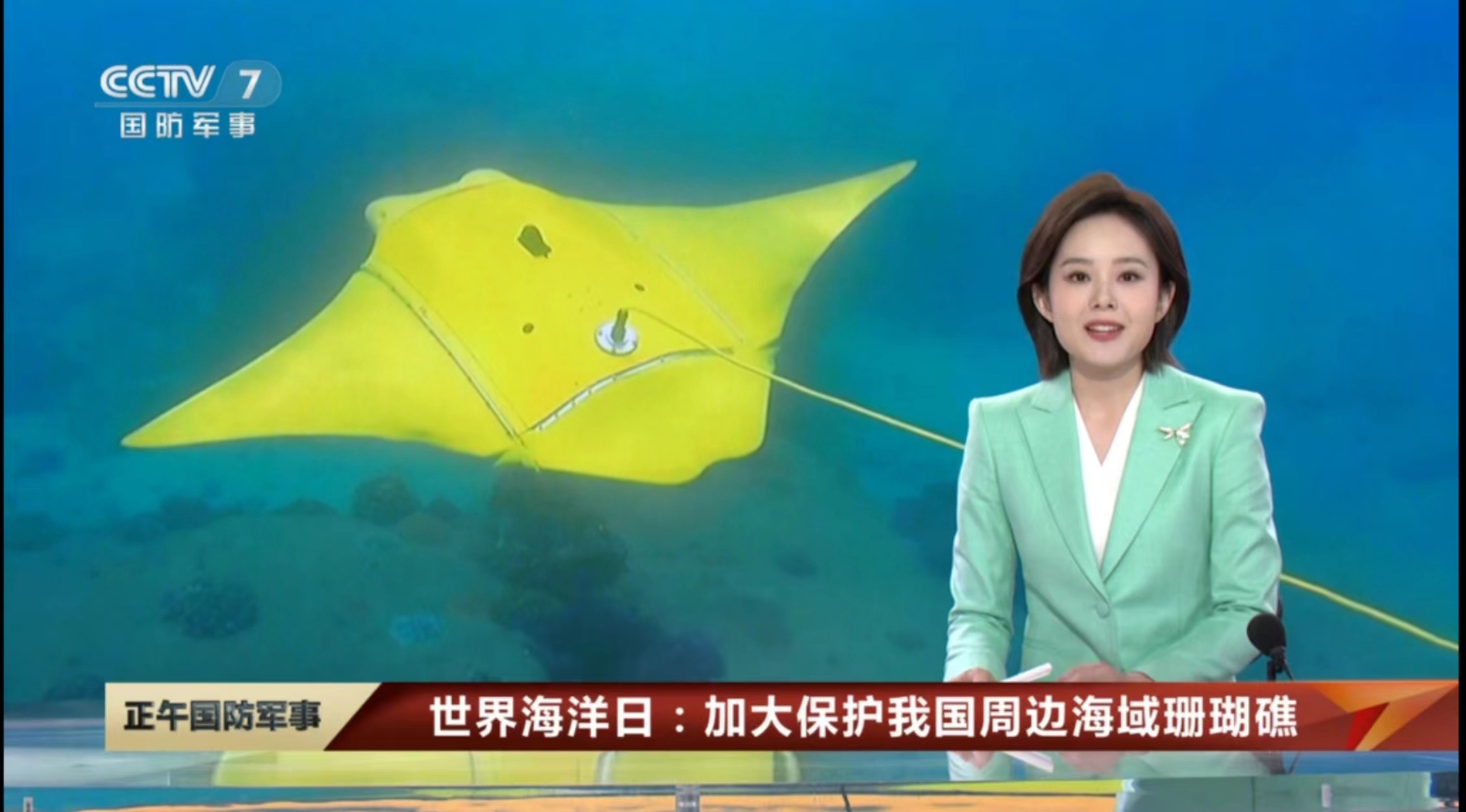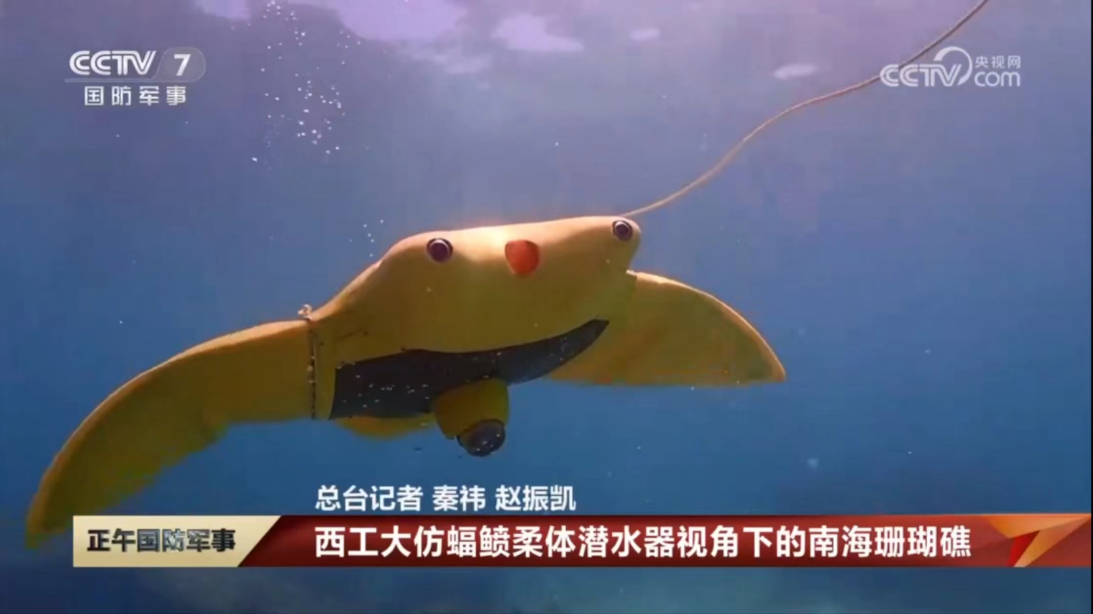 6月7日,央视国防军事频道(CCTV-7)《正午国防军事》栏目在世界海洋日即将到来之际,专题报道了BEAT365仿蝠鲼柔体潜水器。具体报道如下: