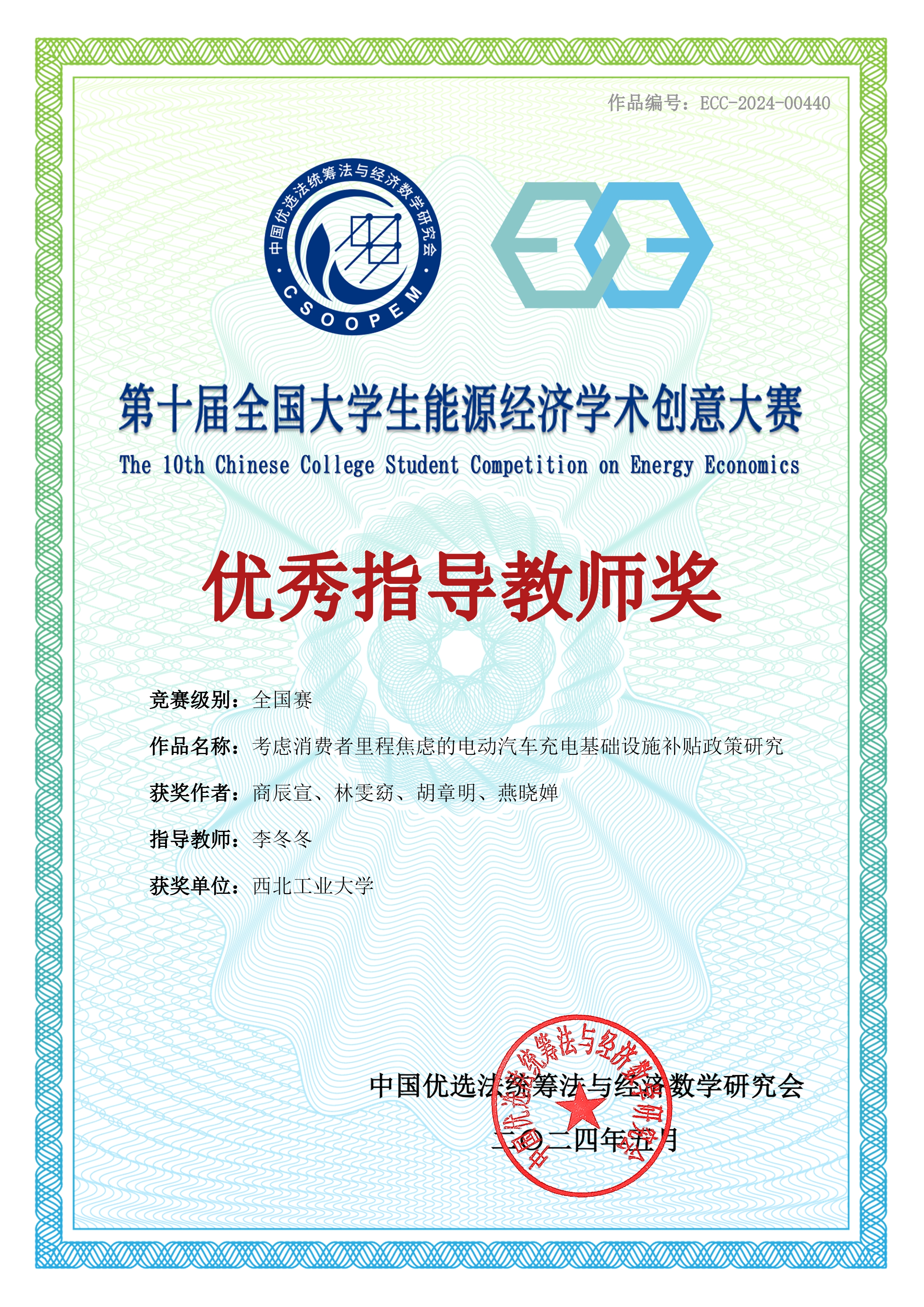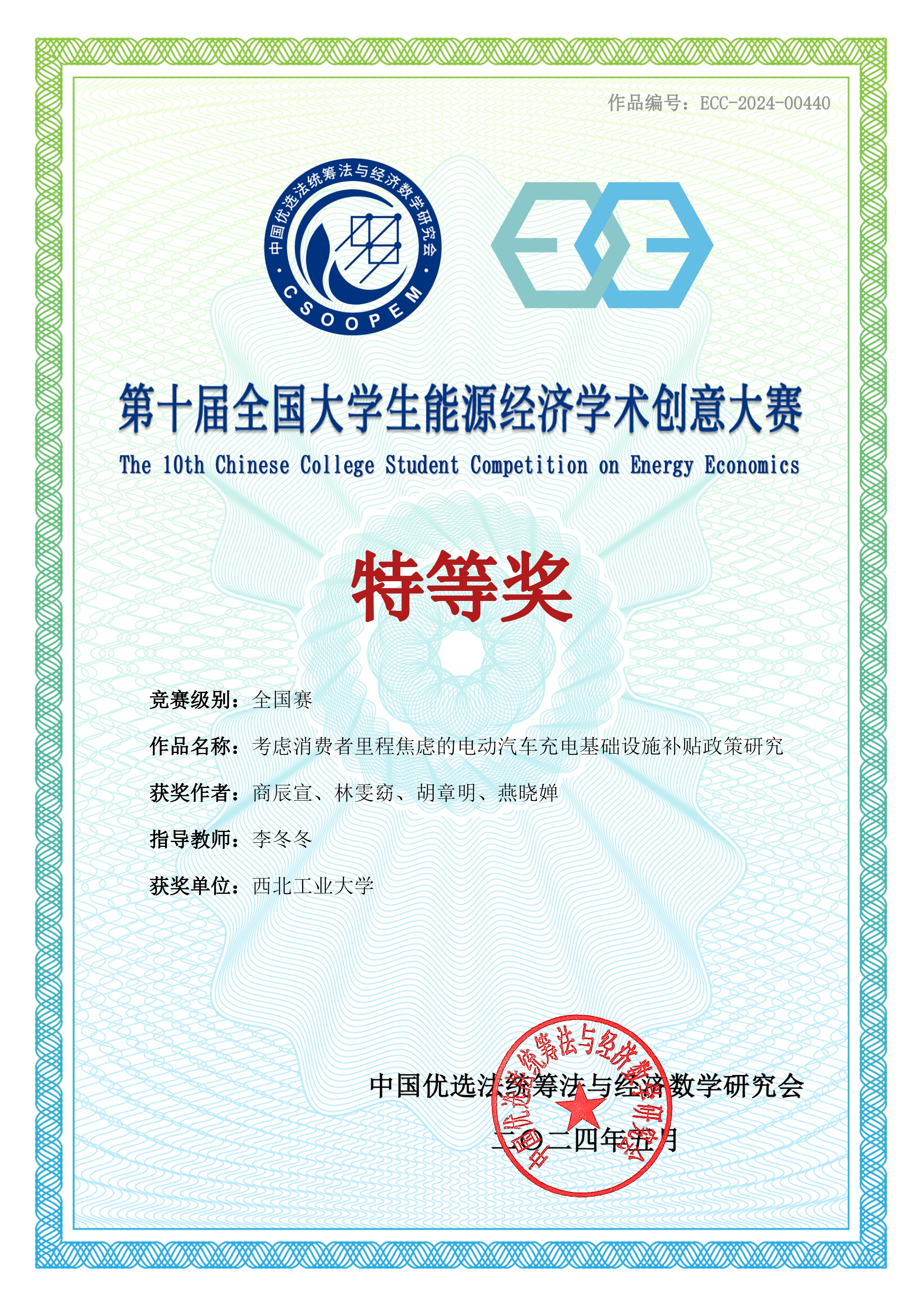 在学校教务部的指导和支持下,公共政策与管理学院的新文科创新实践基地积极组织此次竞赛。基地指导老师李冬冬带队,BEAT365公共政策与管理学院本科生商辰宣、林雯窈、胡章明、燕晓婵组成的参赛团队凭借参赛论文《考虑消费者里程焦虑的电动汽车充电基础设施补贴政策研究》,荣获全国特等奖。