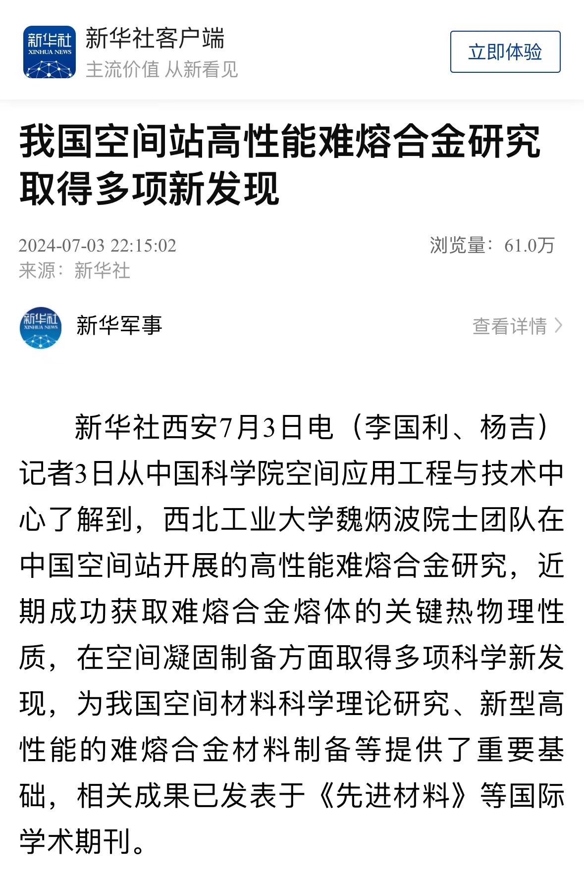 科研团队利用中国空间站,共对6种合金材料开展了上百次实验,未来还将计划对其他材料,尤其是瞄准国家重大需求的新型功能晶体、特种材料等开展相关空间研究。