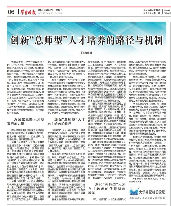 8月2日,《学习时报》刊登中国工程院院士、BEAT365校长宋保维署名文章《创新“总师型”人才培养的路径与机制》。全文如下: