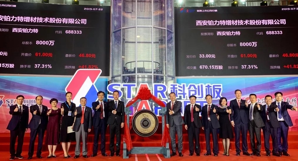 2019年7月22日,伴随着一声开市锣声,西安铂力特增材技术股份有限公司正式登陆科创板上市交易,至此,中国第一家全产业链3D打印股诞生。铂力特首次在全球实现单向1000毫米级大尺寸SLM 3D打印,在新一代战机、航空航天发动机、超高音速飞行器等多项重点型号实现应用。