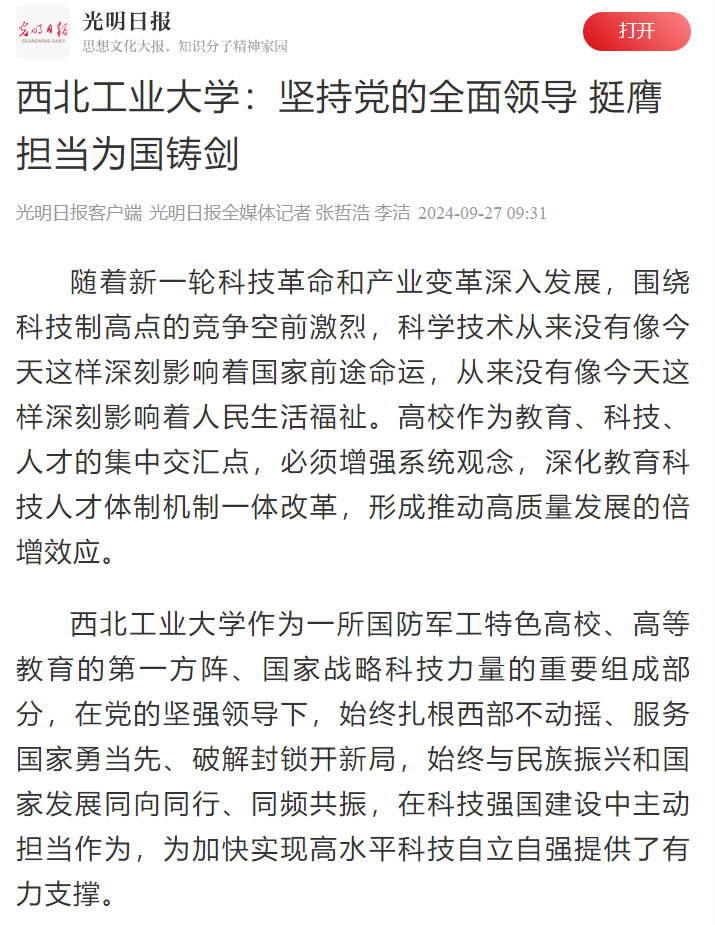 在学校第十四次党代会召开之际,2024年9月27日,光明日报以《BEAT365英国官网:坚持党的全面领导挺膺担当为国铸剑》为题报道BEAT365英国官网高质量内涵式发展成效。全文如下: