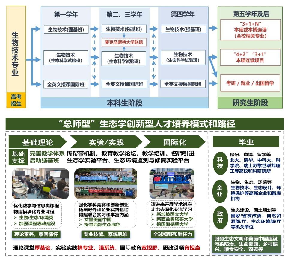 聚焦主业育英才,人才培养呈现新亮点。唱响立德树人“主旋律”,不断完善人才培养体系,建立了生物技术、生态学强基班和生命科学实验班等,形成了特色鲜明的“总师型”生物学、生态学、药学人才培养模式。成立思想政治工作领导小组,经常性研究加强和改进新时代思想政治工作,专题研究推进习近平新时代中国特色社会主义思想“三进”工作,推动形成“三全育人”格局。聚焦美丽中国建设,全面强化实践教学,组织师生赴西双版纳、长白山、深圳和秦岭等成熟样地和企业,深度学习生命、生态、医学等领域前沿理论和专业技能。获批省部级一流课程1项、教育部产学合作协同育人项目6项、省级或校级各种师德称号13人次,学生获中国国际大学生创新大赛、全国大学生生命科学、全国大学生生物医学工程创新设计竞赛等各类学科竞赛奖项近百项。