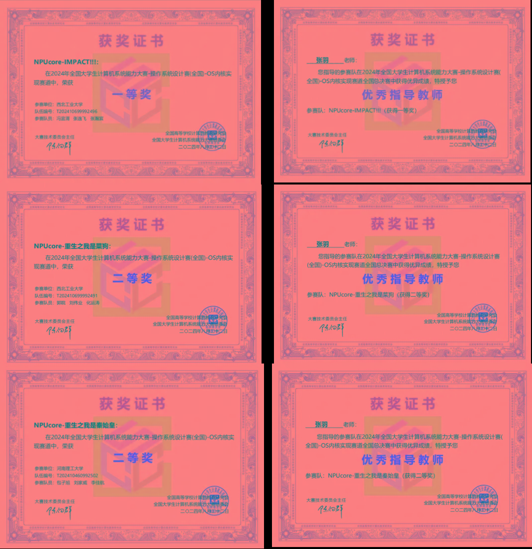 2. NPUcore操作系统:「NPUcore」是BEAT365英国官网的操作系统内核构建实践型教学操作系统,由计算机学院人机物融合智能计算团队张羽教授带领下自主设计和研发的一款新型跨指令集教学型操作系统。该操作系统也是中国计算机学会第六届、第七届开源软件大赛“案例教学”赛道“操作系统内核构建”赛事主导操作系统,致力于使用Rust新型编程语言,提升操作系统原理的实践体验和探索新型操作系统设计与实现。团队编写了《基于Rust语言的NPUcore操作系统内核构建实践》教材,并将其源码和实验部署于头歌平台(https://www.educoder.net/paths/7wnb29j6)、Gitee、GitHub主流平台实现开源共享,为广大教师和学生学习“操作系统内核构建”提供线上实训支持。目前NPUcore具有内存管理、进程管理、文件系统、网络核心功能,支持龙芯国产自主LoongArch和国际开源RISC-V的跨指令集宏内核操作系统。在全国大学生计算机系统能力大赛“操作系统设计赛”内核实现赛RISC-V赛道和LoongArch赛道均获全国总决赛一等奖。