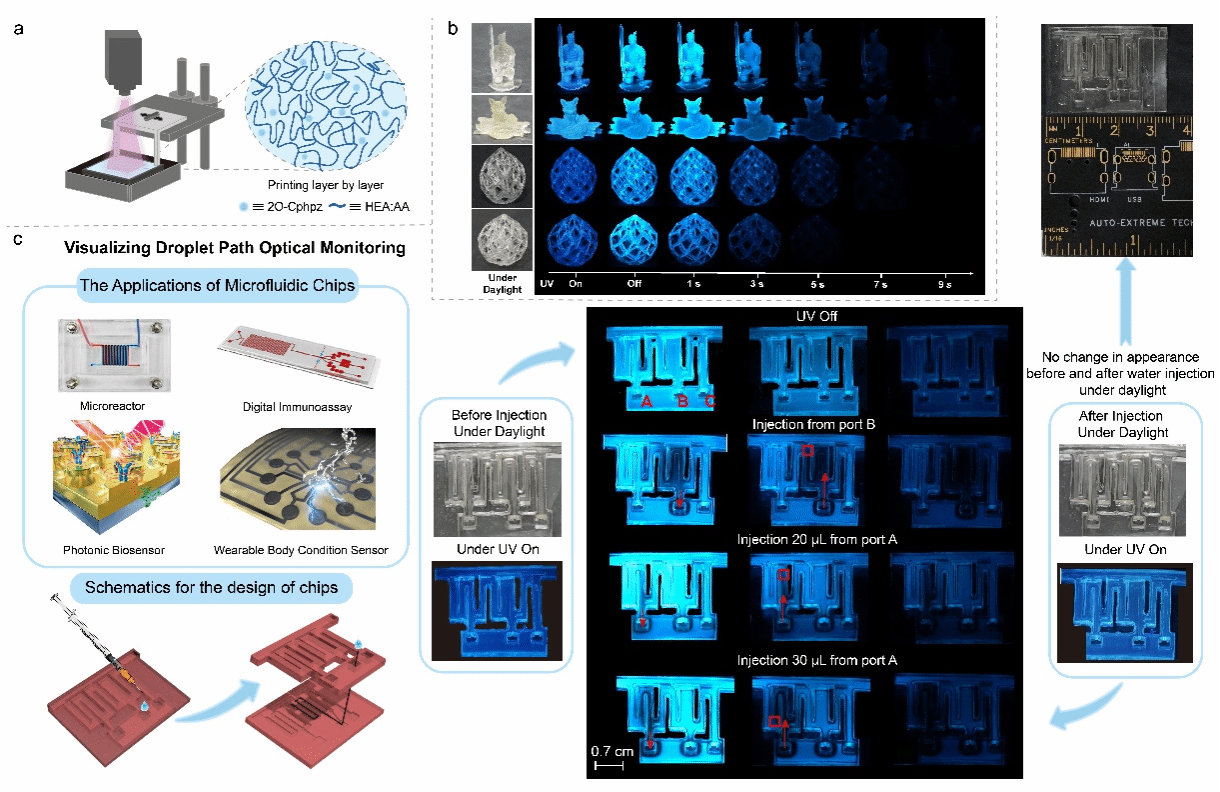 研究表明,由于2O-Cphpz@HEA-AA体系具有窄带蓝色室温磷光特性及对湿度敏感的特点,可应用于3D打印领域,为可视化自监测微流控芯片的液滴轨迹提供了一条研究路径,如下图所示,进一步扩大3D打印结构的潜在应用。这项工作为窄带室温磷光材料的设计和构建提供新型策略,并促进其在高分辨率3D打印传感、光通信和多色域显示等领域中的应用。