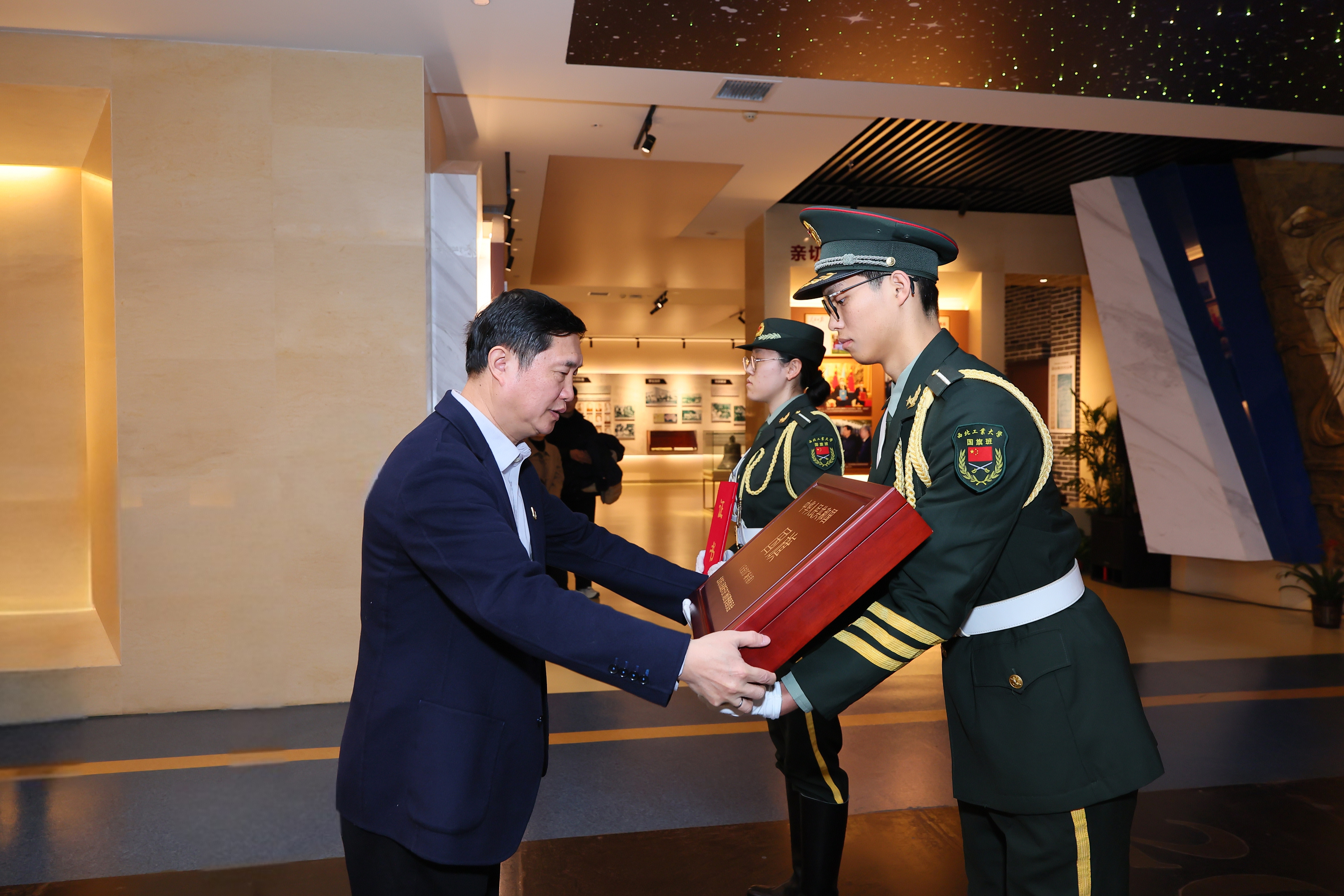 12月4日上午,在长安校区校史馆举行迎领天安门国旗仪式。副校长詹浩,团委、党委宣传部等单位负责人、国旗班学生代表等参加。仪式由校团委书记佘磊磊主持。