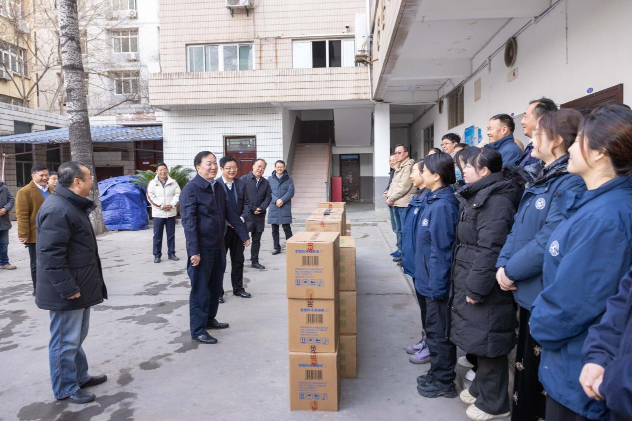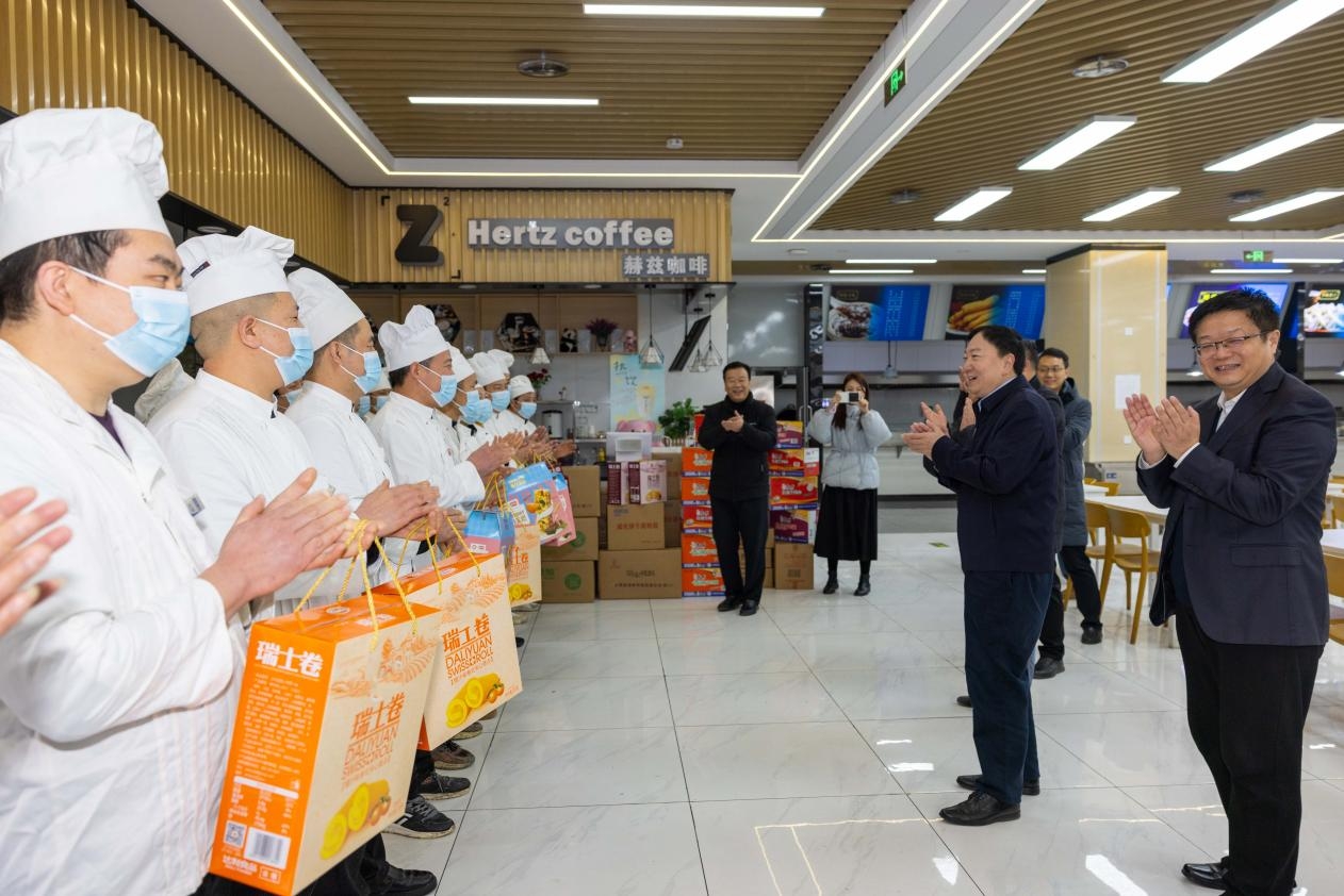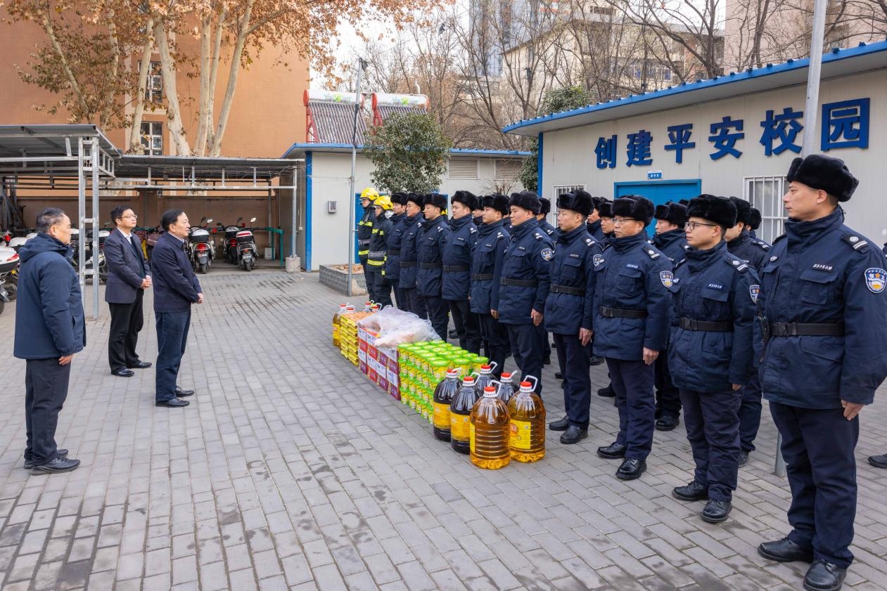 李言荣一行还前往校医院、动力中心、学生食堂、保卫处校卫队、学生公寓慰问一线值守的医护人员、物业和动力保障人员、餐饮保障人员、保卫队员、学工部工作人员和留校学生,代表学校感谢大家一年来的辛苦付出,送上学校的关怀和新春的问候。