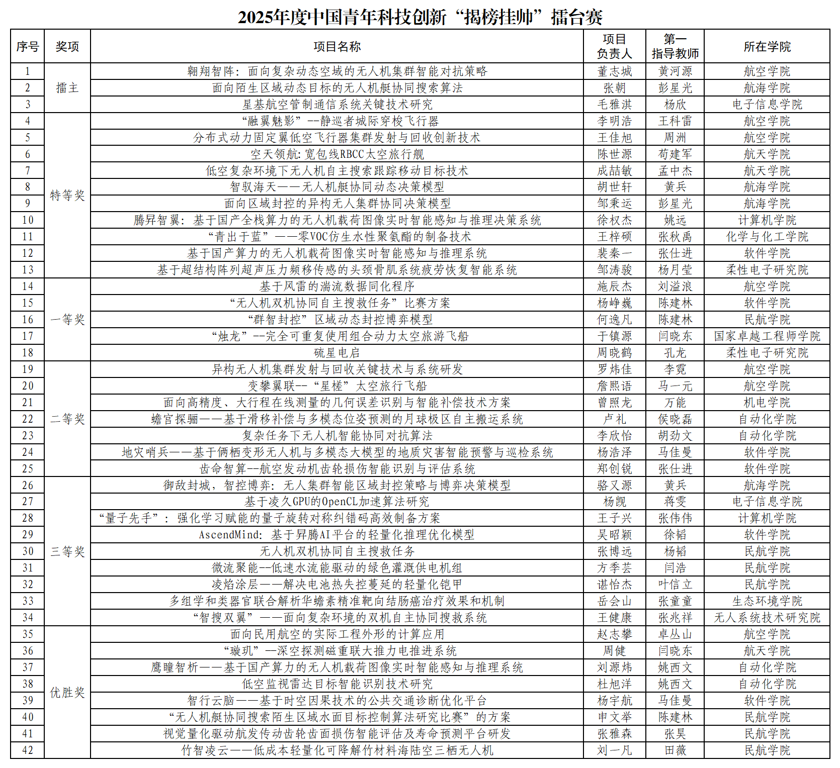 在2025年度中国青年科技创新“揭榜挂帅”擂台赛中,共42个项目获奖,其中,擂主(全国第一名)3项、特等奖10项、一等奖5项、二等奖7项、三等奖9项、优胜奖8项,创历史最好成绩;此前,在本届“挑战杯”竞赛2024年度“揭榜挂帅”专项赛中,BEAT365共获得擂主1项、特等奖5项、一等奖11项、二等奖10项、三等奖5项。在本届“挑战杯”竞赛周期内,两年共计获得擂主4项、特等奖15项、一等奖16项、二等奖17项、三等奖14项、优胜奖8项。