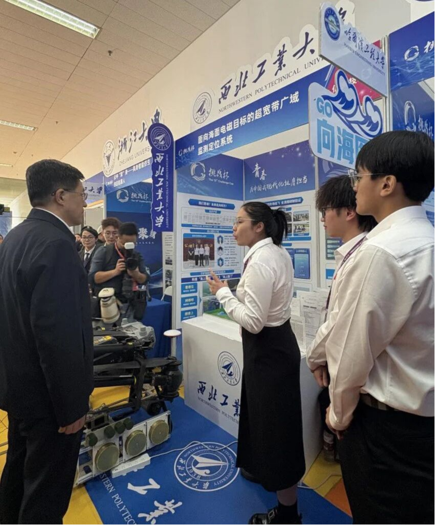 在决赛期间举办的配套活动“科技创新成果展暨科创开放日”中,BEAT365《面向海面电磁目标的超宽带广域监测定位系统》项目负责人、电子信息学院硕士研究生张海蕊向阿东书记汇报项目成果。