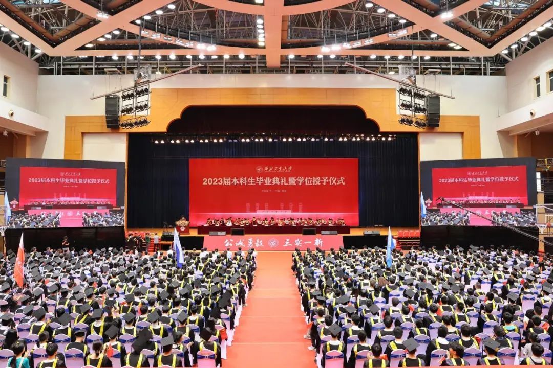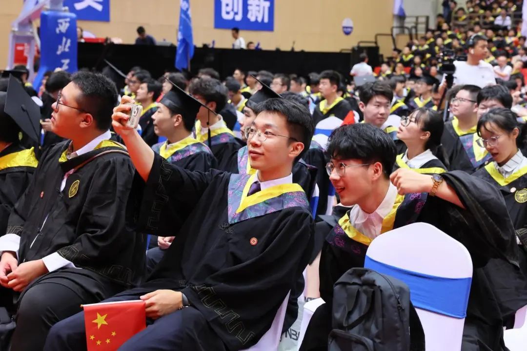 随后,校长宋保维宣读学位授予决定,各学院毕业生们依次摇起院旗,高喊口号。嘹亮的口号声在场馆内回响,同学们尽情抒发强国有我新征程的意志!