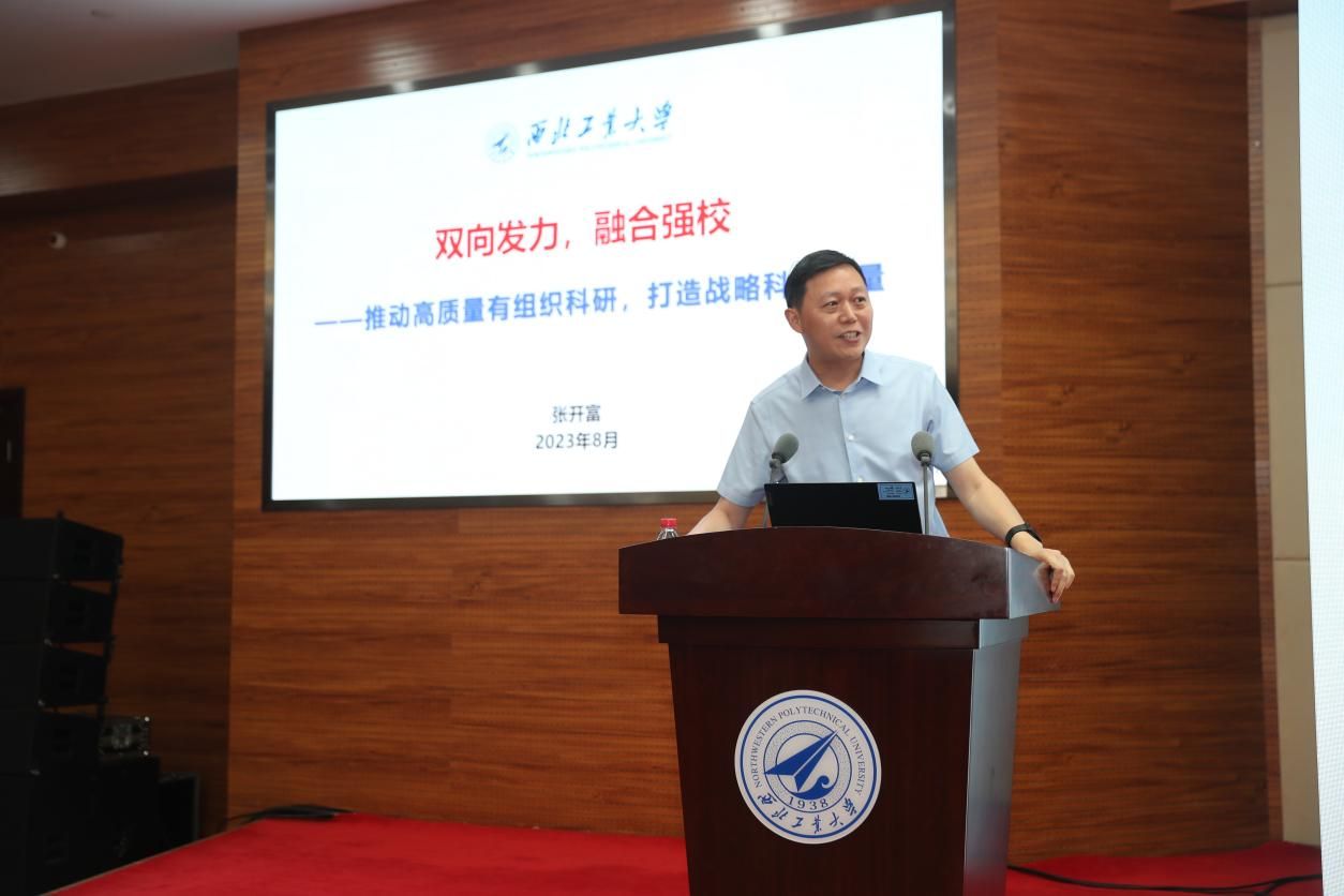 张开富围绕“双向发力,融合强校”,提出了进一步推动高质量有组织科研的工作思路,要着力提升科研团队的核心竞争力,聚焦国家重大需求,持续强化方向-队伍-平台-项目-成果的创新链条,打造国家战略科技力量。