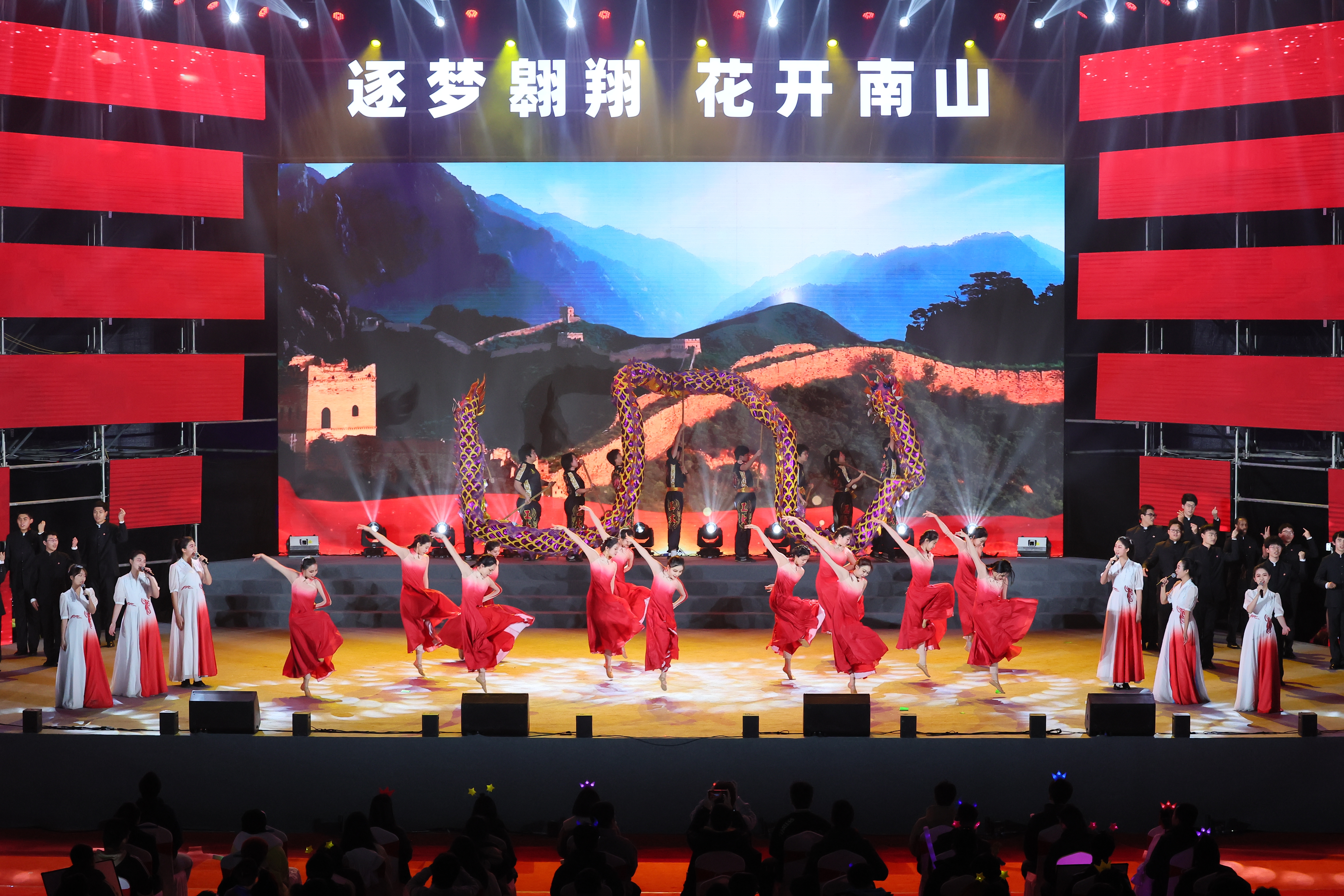由红枫叶艺术团退休教师代表、学院书记代表、大学生艺术团、舞龙队带来了朗诵《大写的中国》和歌舞《万疆》。慷慨激昂的文字和曲调,句句声声道出BEAT365英国官网人真挚的爱国情感。为国铸剑、强国有我,BEAT365英国官网人从不缺席!