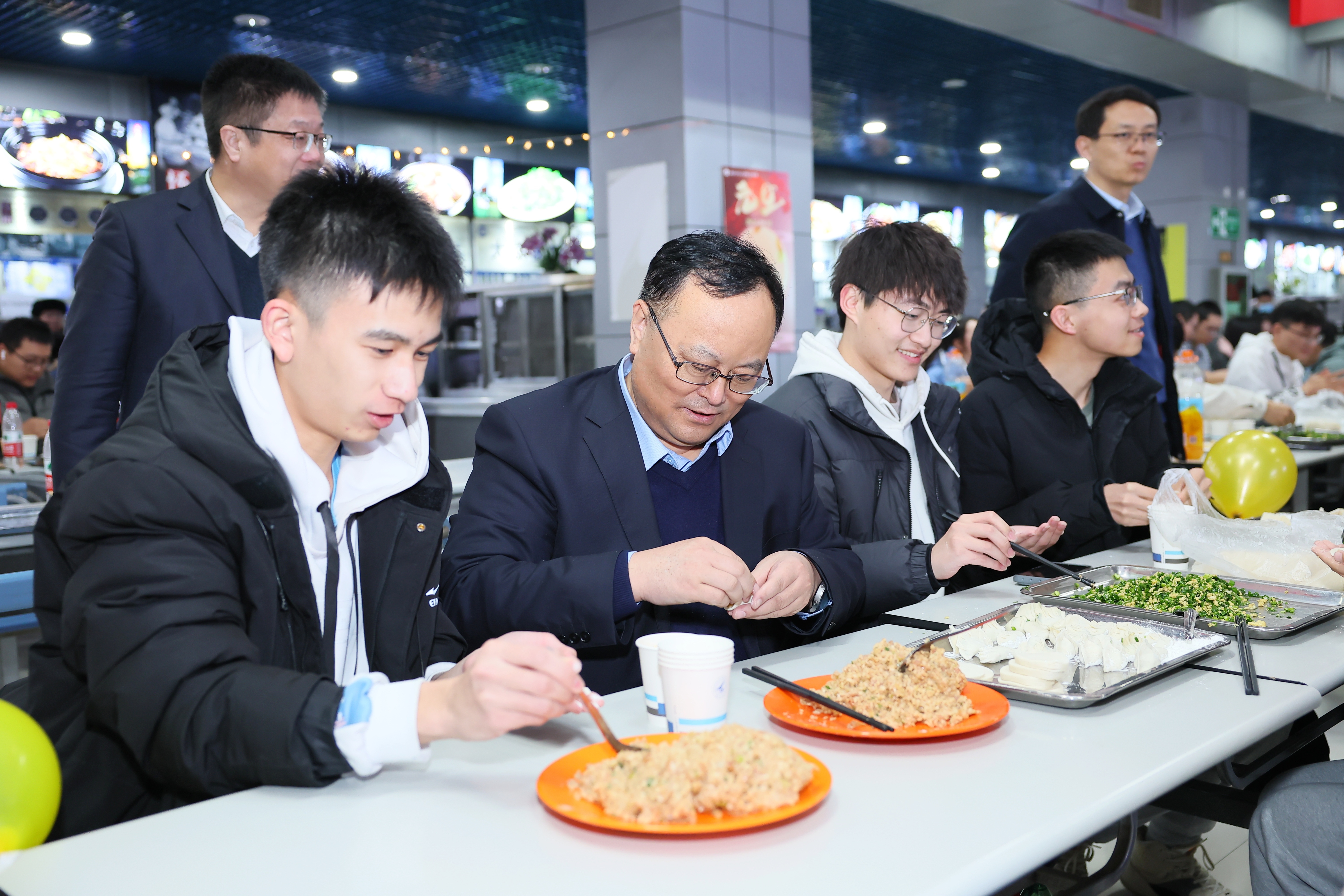 晚会开始前,各培养单位组织同学们一起包饺子、吃团圆饭,李言荣,宋保维等校领导来到现场参与活动,和同学们亲切交谈,温暖祥和的新年氛围萦绕在餐厅之中。