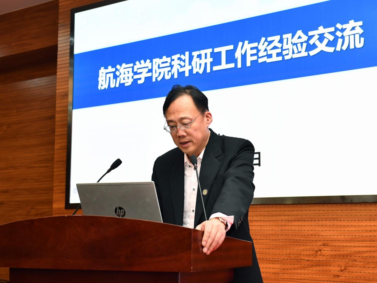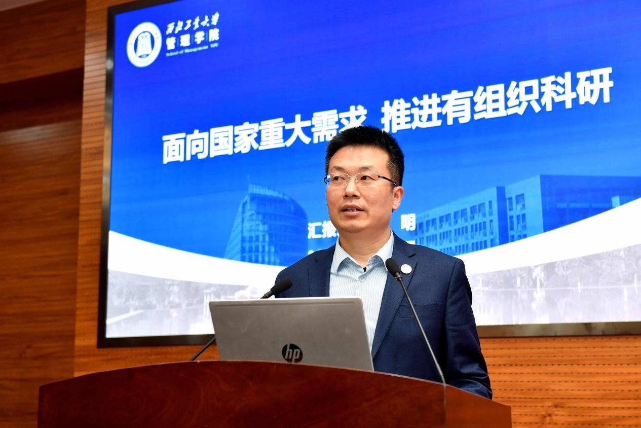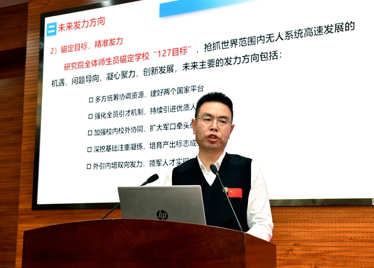 航海学院院长潘光、无人系统技术研究院副院长符文星、管理学院副院长贾明依次作科研工作经验交流汇报。