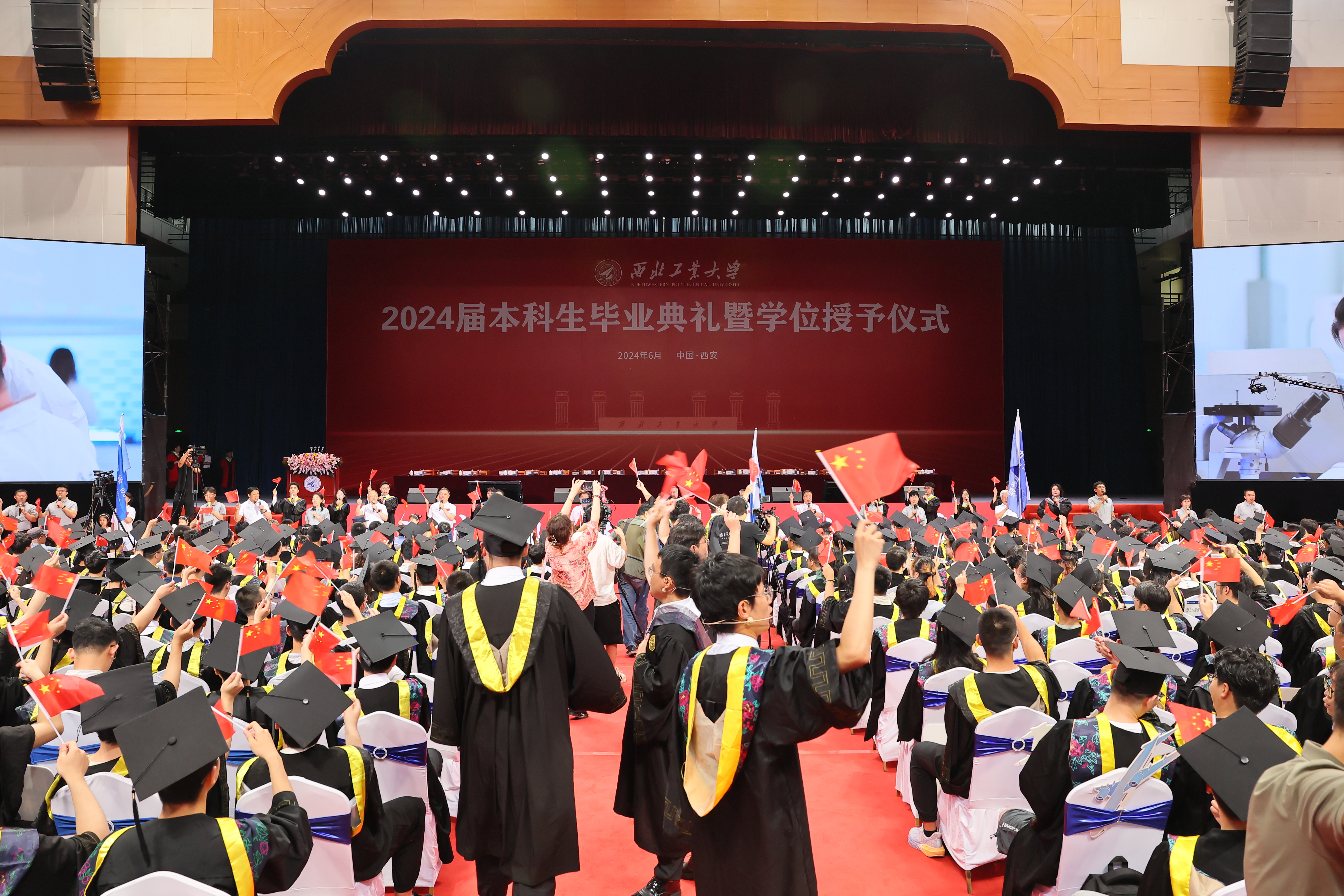 随后,校长宋保维宣读学位授予决定,各学院毕业生们依次摇起院旗,高喊口号。嘹亮的口号声在场馆内回响,同学们尽情抒发强国有我新征程的意志!
