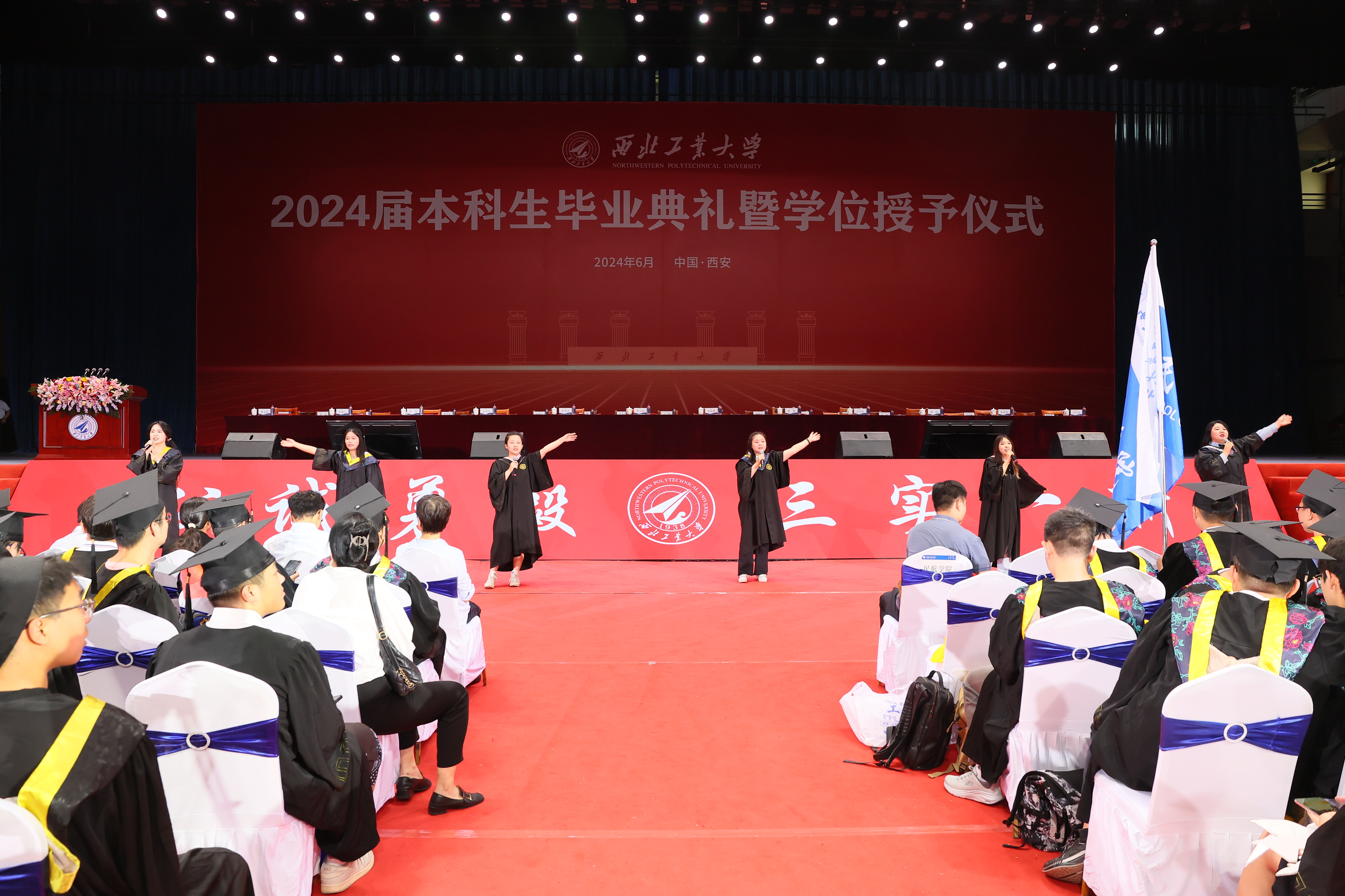 毕业生代表共同演唱的2024年本科生毕业原创歌曲《我们》让典礼现场气氛高涨、温情涌动。由学生代表、教师代表、离退休老师们以及可爱的少年儿童共同演唱的歌曲《祖国不会忘记》将暖场气氛推向高潮,“同学们:强国建设,祖国复兴,你们准备好了吗?”“时刻准备,为国铸剑!为国铸剑!为国铸剑!”铮铮誓言回荡在翱翔体育馆上空,也激荡在学子们心中。