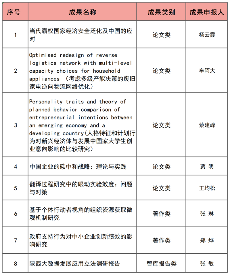 近日,陕西省人民政府发布了关于表彰第十六次哲学社会科学优秀成果的通报,此次BEAT365获奖23项。其中一等奖8项(著作奖2项,论文奖5项,智库报告奖1项),二等奖4项(著作奖1项,论文奖3项),三等奖11项(著作奖4项,论文奖7项)。获奖总数较上一次增加5项,其中一等奖增加了4项,增幅100%,实现了获奖质量与数量的双重突破,创BEAT365陕西省哲学社会科学成果奖励历史新高。
