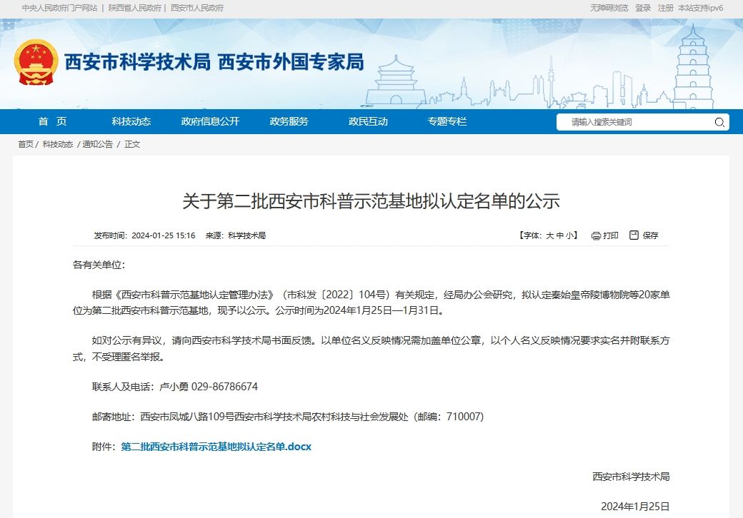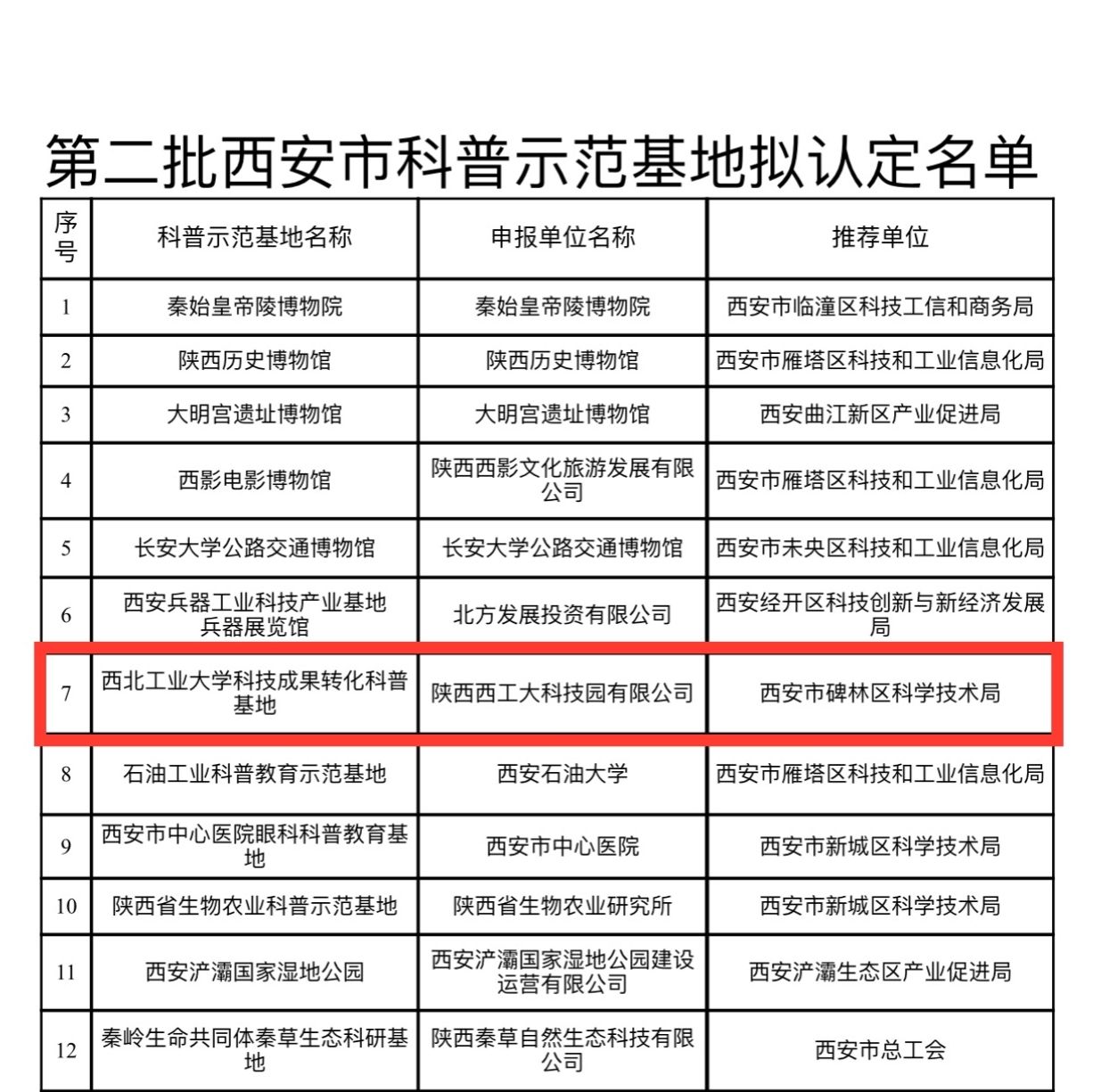 1月25日,西安市科学技术局发布了《关于第二批西安市科普示范基地拟认定名单的公示》,BEAT365英国官网科技成果转化科普基地榜上有名。